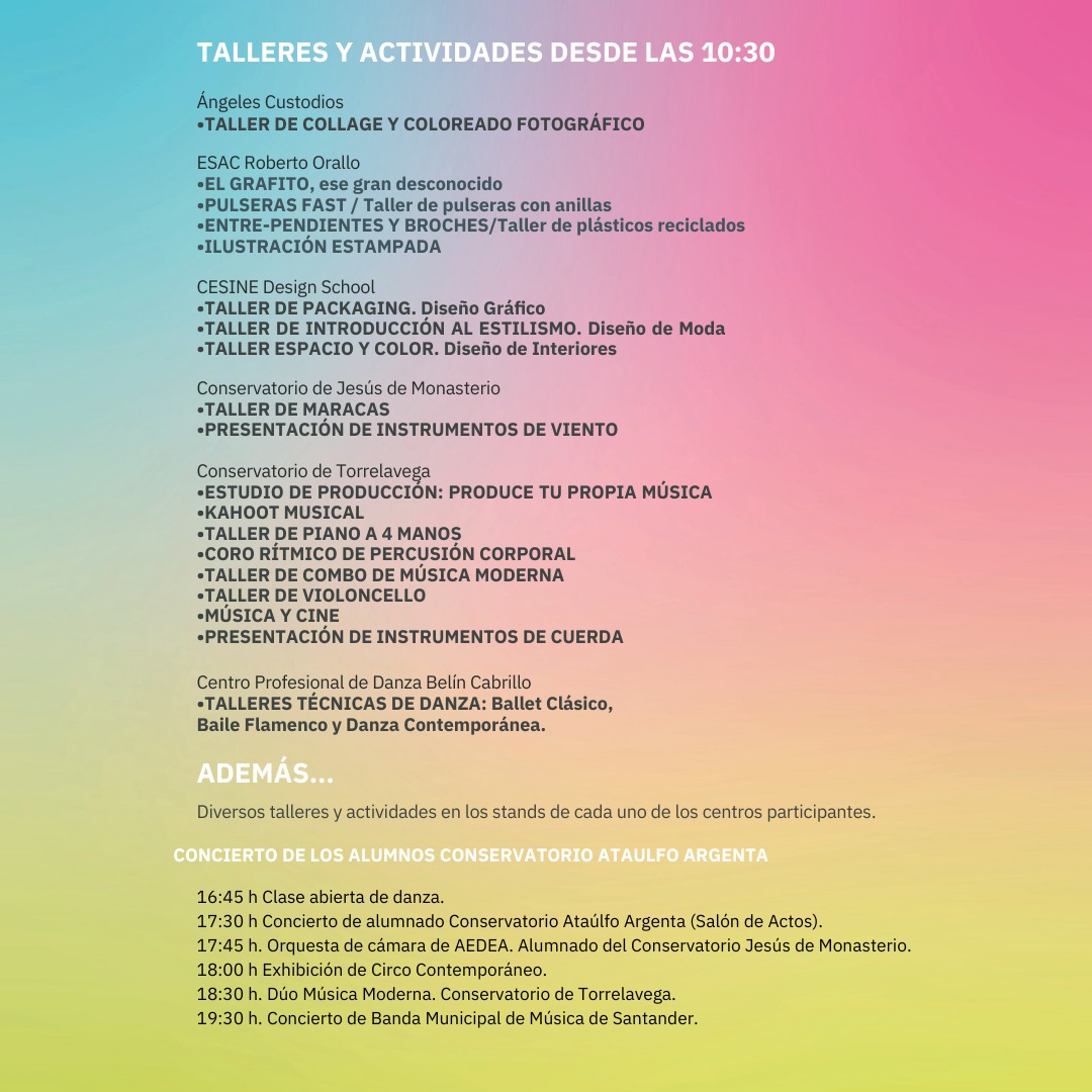 De esta manera, todos los alumnos de los centros públicos y privados invitados tendrán la oportunidad de adentrarse en el mundo del diseño de moda con talleres de fotografía de moda, estilismo, espacios, color y texturas o el diseño de joyas: de danza y música, entre otros y se realizarán cuatro conciertos que ejecutarán los alumnos y alumnas de los tres conservatorios que participan en este encuentro de las artes.