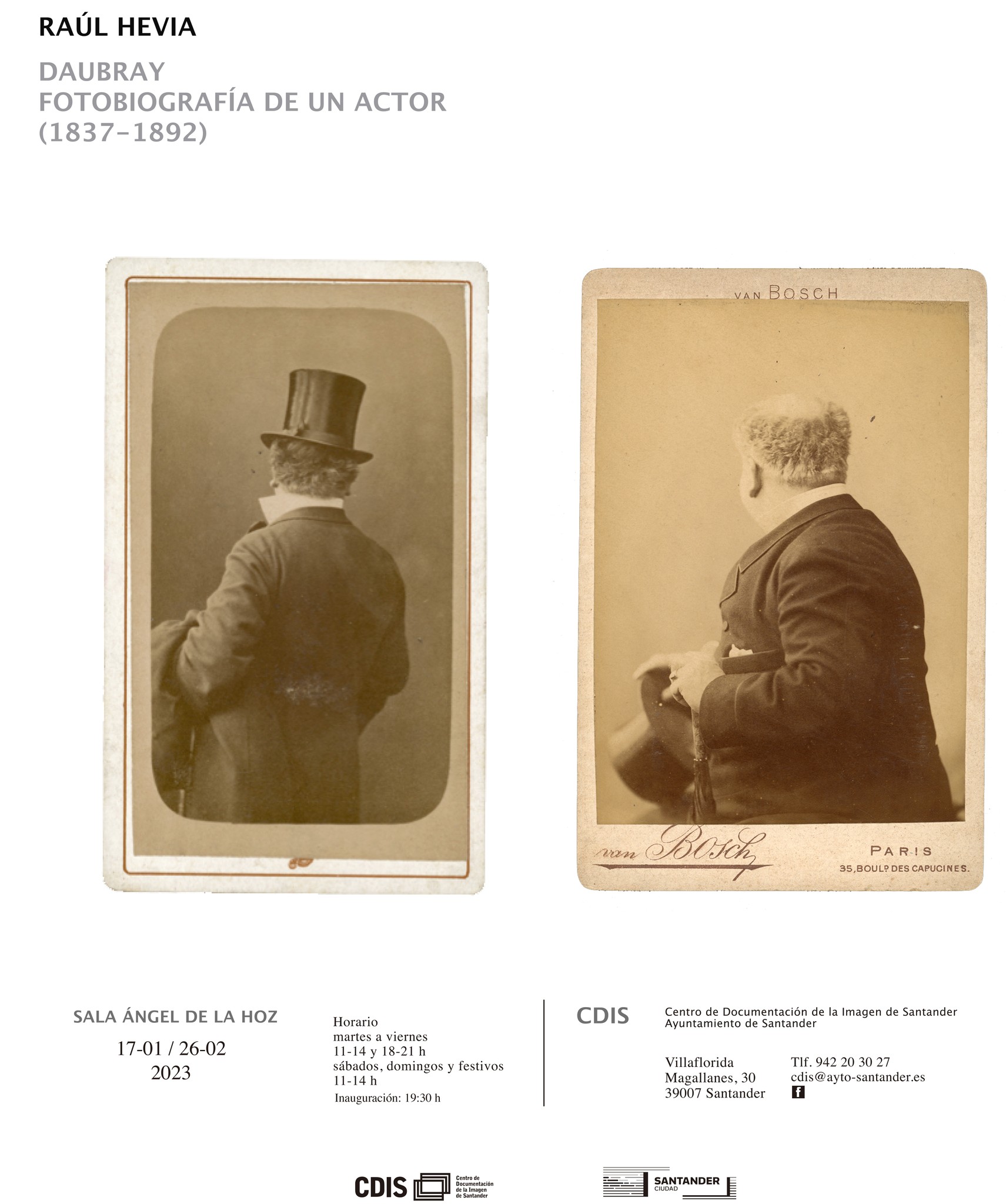 La Concejalía de Cultura ha programado una nueva exposición en el Centro de Documentación de la Imagen de Santander (CDIS), que se podrá visitar hasta el próximo 26 de febrero. “Daubray, fotobiografía de un actor (1837-1892)” es un proyecto de Raúl Hevia planteado como un ensayo, un lugar de reflexión sobre el retrato de un artista hoy olvidado. Como todo trabajo desde lo contemporáneo, trata de abrir un espacio crítico. La exposición es un medio para pensar, relacionar, cuestionar, en este caso, la idea de retrato, el paso del tiempo, así como las nociones de actualidad y originalidad. La investigación que la acompaña vendrá recogida en un libro del mismo título dentro de la colección Pequeño formato.