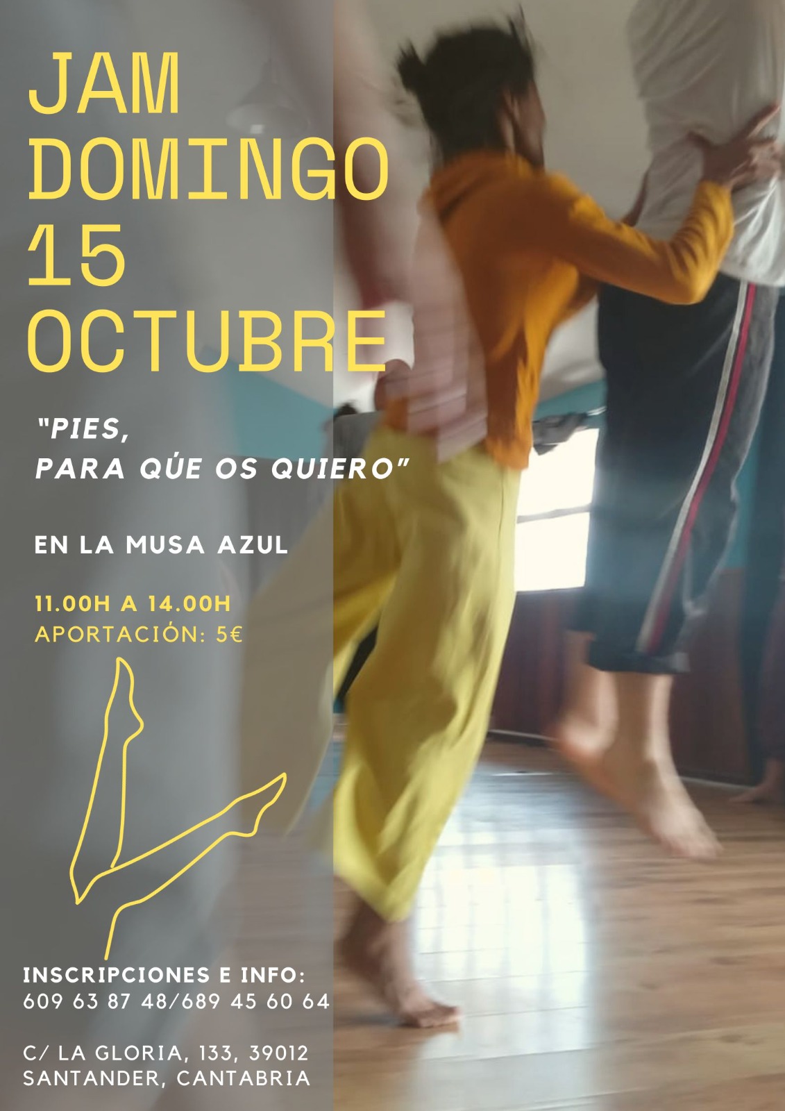 “Esta primera jam nos gustaría empezarla por el principio: los pies. Vamos a ofrecer un rato de protagonismo a esa parte del cuerpo que nos sostiene y a la vez nos da infinita libertad. Haremos movilización de pies, propios y ajenos, para después bailar desde los pies y con los pies como calentamiento para la jam. ¡Piesvenidxs!”