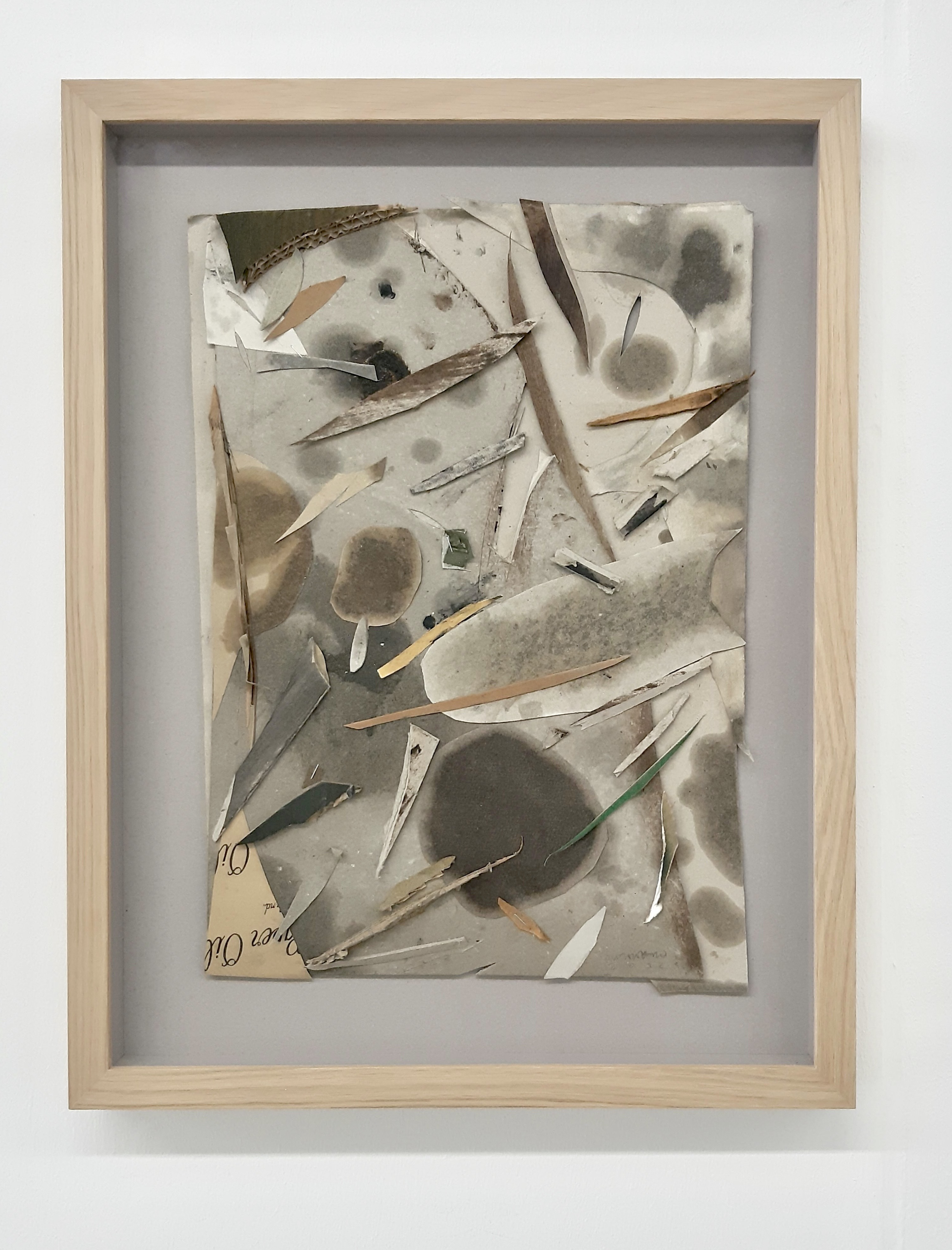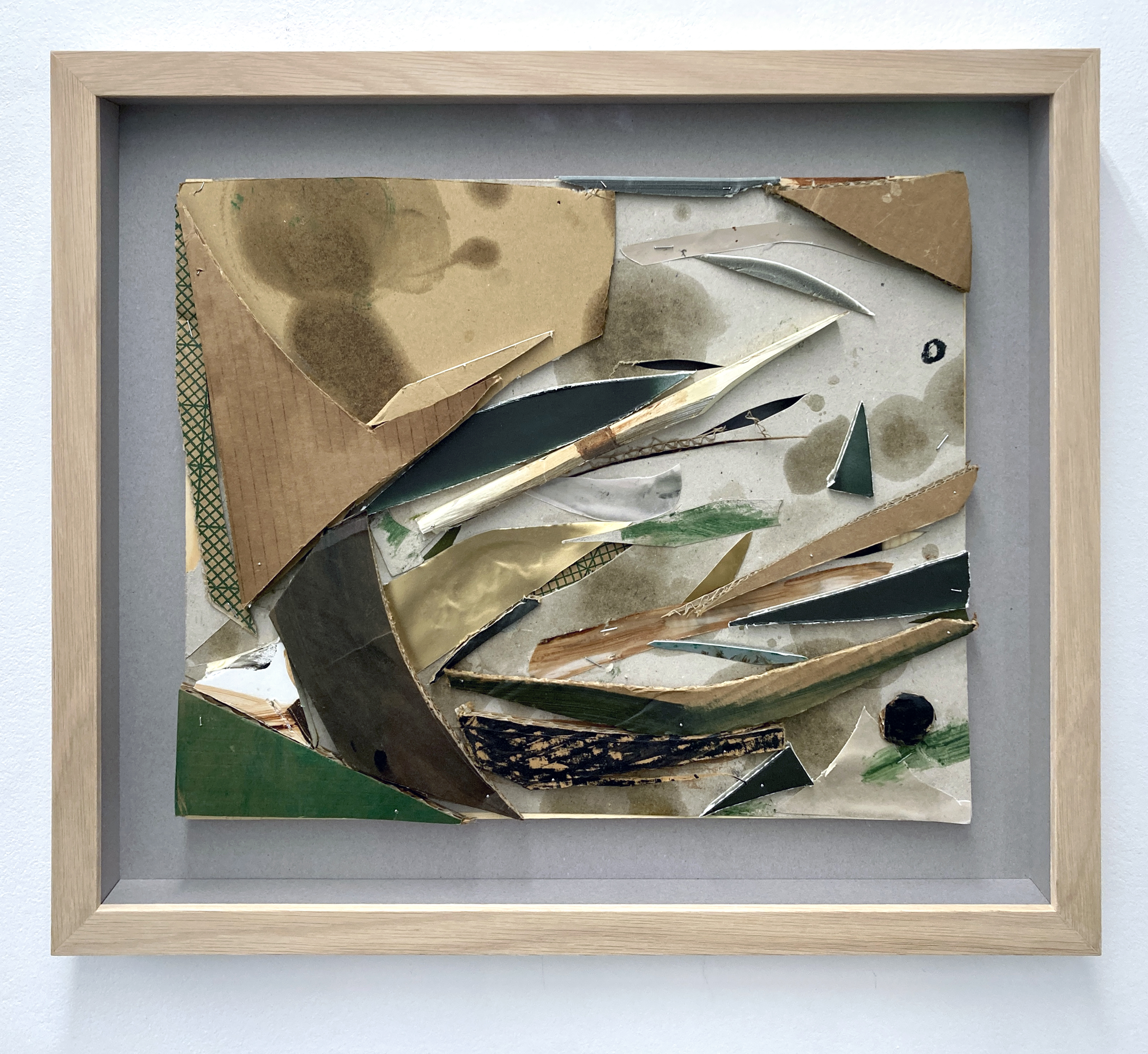 Por un lado, vamos a encontrar collages fotográficos en los que el olivo y su voluptuosidad son protagonistas, nuevas piezas de collage sobre cartón, además de una serie de collage sobre papel, donde el aceite sobre la estraza y los restos de materiales sobrantes durante el proceso de trabajo dialogan orgánicamente.