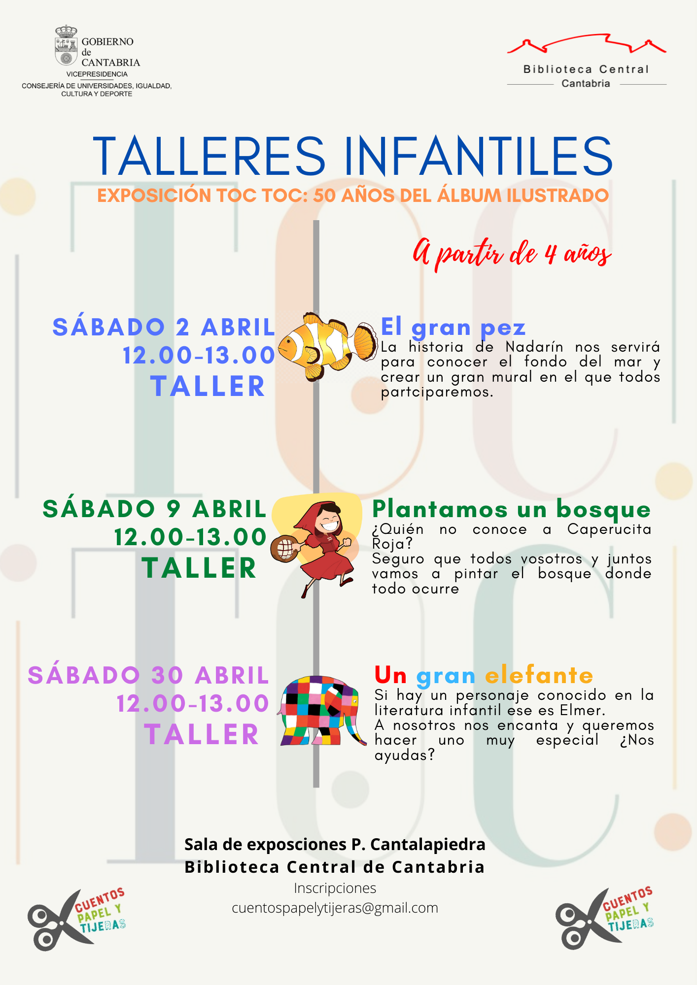 Dirigido a niñas y niños a partir de 5 años. Imprescindible inscripción desde 5 días antes del taller en el correo cuentospapelytijeras@gmail.com .