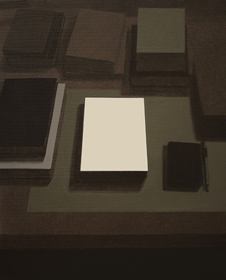 Martín Godoy trabaja de manera recurrente con el tema de la propia historia del arte y de la actividad artística y en sus series abundan las referencias al estudio del artista, el momento de la creación de una obra, el lienzo o papel en blanco o los materiales y las mesas de trabajo. En esta ocasión, en varias de las piezas el centro de la composición lo ocupa un lienzo en blanco, estando presente un juego habitual en el trabajo del artista en el que lo más interesante de la obra acontece en el fondo, en la parte oscura, aquí ocupada por botes de pintura, pinceles y el habitual orden o desorden de un estudio. Otras piezas muestran libros, siempre presentes como fuente de investigación e inspiración para el artista, aquí retratados como objetos luminosos, pesados, cargados de misterio. A través de un trabajo de sobriedad y síntesis en el aspecto visual, el artista plantea un constante juego con la geometría presente en nuestro entorno, la confrontación de la figuración con la abstracción o el misterio en la vida cotidiana, siempre con la presencia latente de una tensión emocional que se esconde tras una aparente frialdad en la primera observación.