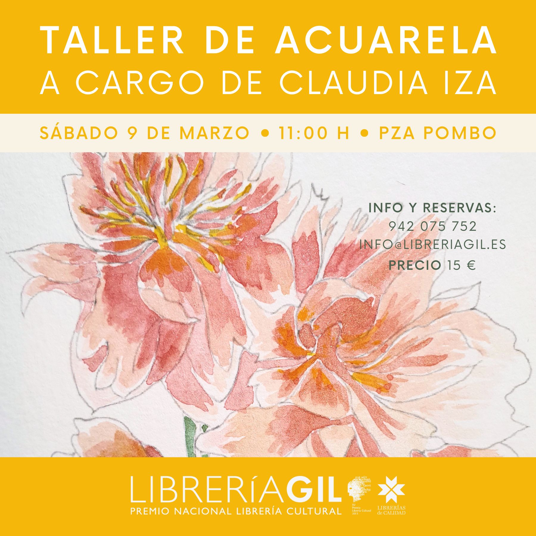 Taller de acuarela para adultos a cargo de Claudia Iza. el sábado 9 de marzo a las 11:00 h. Todos los materiales incluidos. Precio: 15€. Imprescindible reservar plaza en: 942 075 762 / info@libreriagil.es