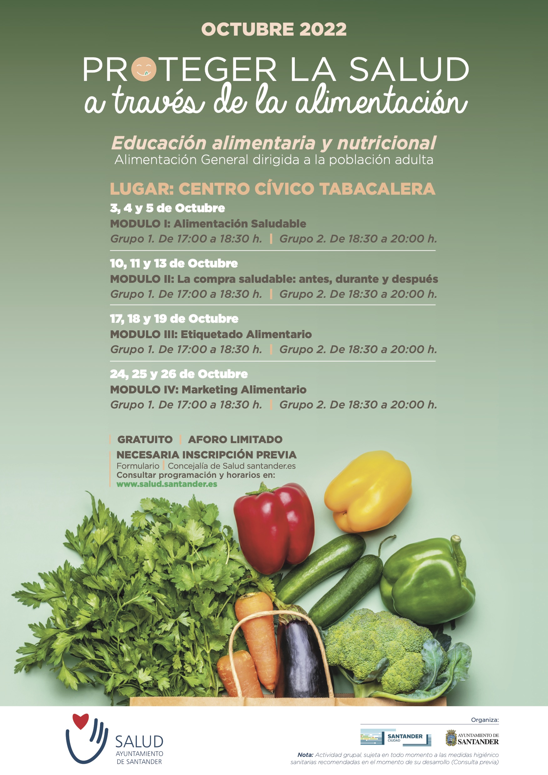 El Servicio de Salud del Ayuntamiento de Santander organiza el taller “Proteger la salud a través de la alimentación”, dirigido a la población adulta. Se impartirá en el Centro Cívico de Tabacalera del 3 al 26 de octubre.