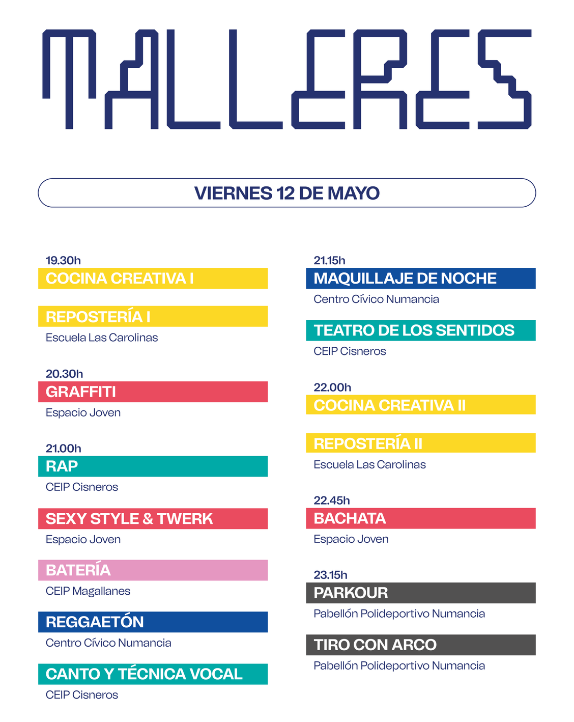 Todos los talleres son gratuitos, para jóvenes de 15 a 30 años (nacidos de 1992 a 2008). Algunas actividades requieren inscripción previa.