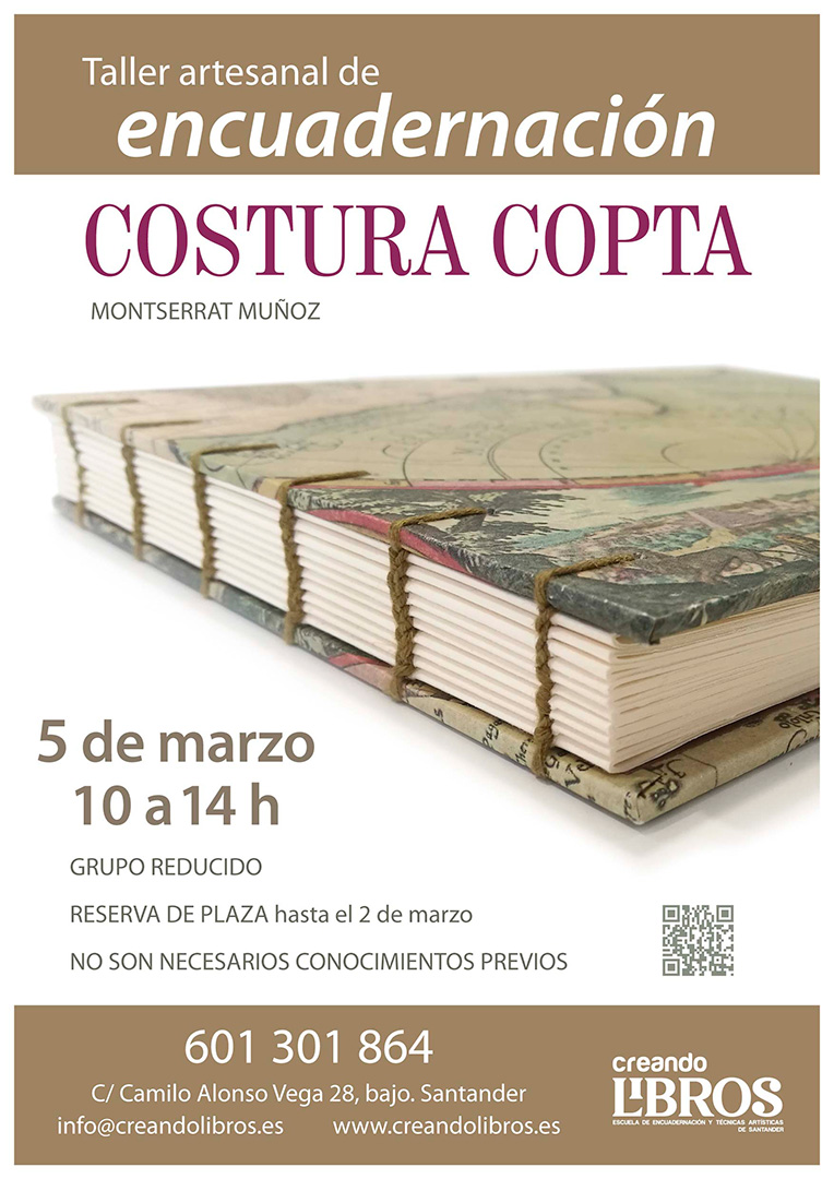 El 5 de marzo imparten un nuevo taller de cuatro horas en su sede de Santander. En él, las alumnas/os crearán artesanalmente un cuaderno de tapa dura, cosido con una de las costura vista más antiguas, la Copta. Posee un acabado atractivo y está pensada para una apertura total del libro.