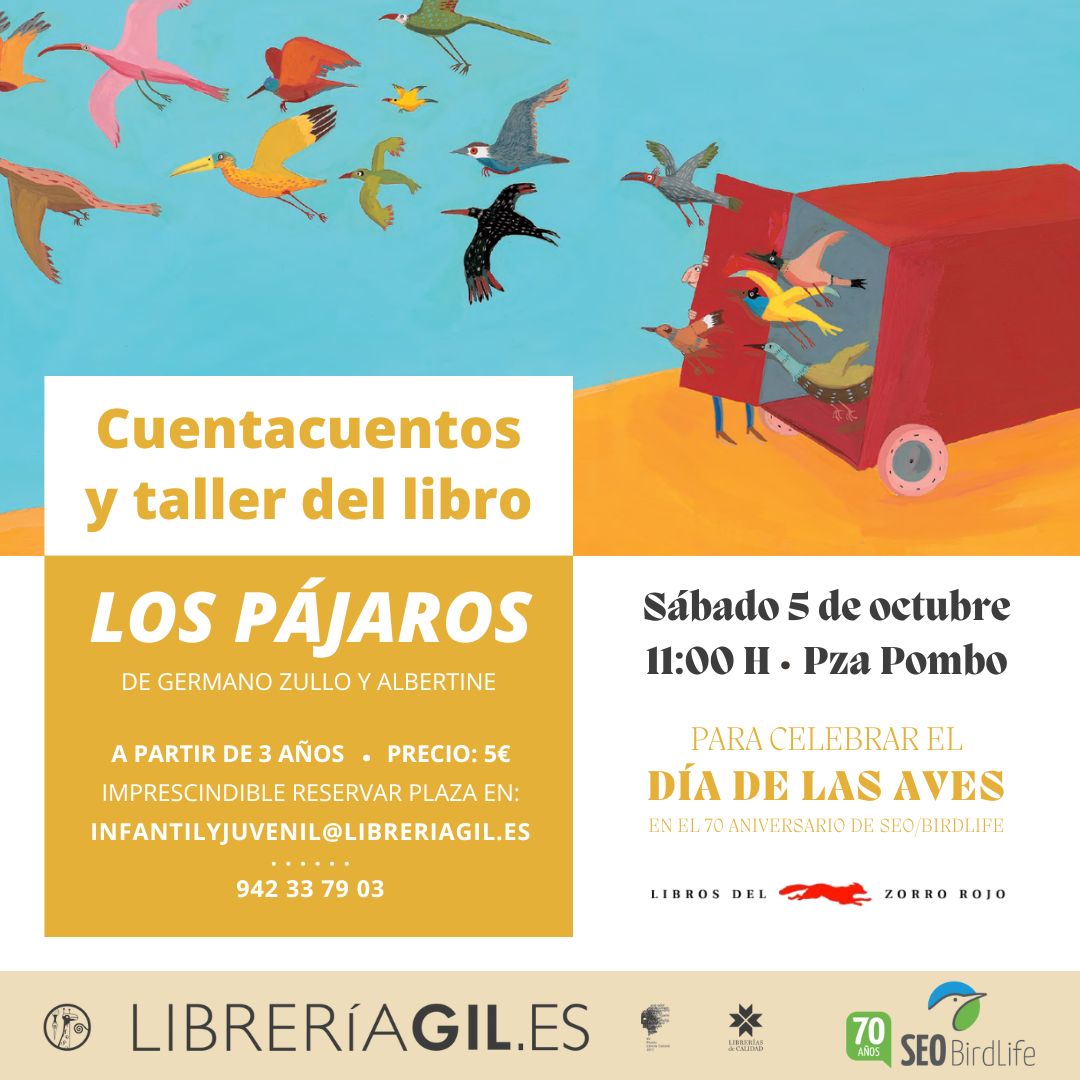 El sábado 5 de octubre, a las 11:00 h., con motivo de la celebración del Día Mundial de las Aves Migratorias, tendrá lugar en Gil un cuentacuentos y taller inspirado en “Los pájaros”, de Germano Zullo y Albertine. Además de leer el cuento, los participantes harán una pequeña actividad relacionada con las aves. En colaboración con SEO/BirdLife Cantabria.
