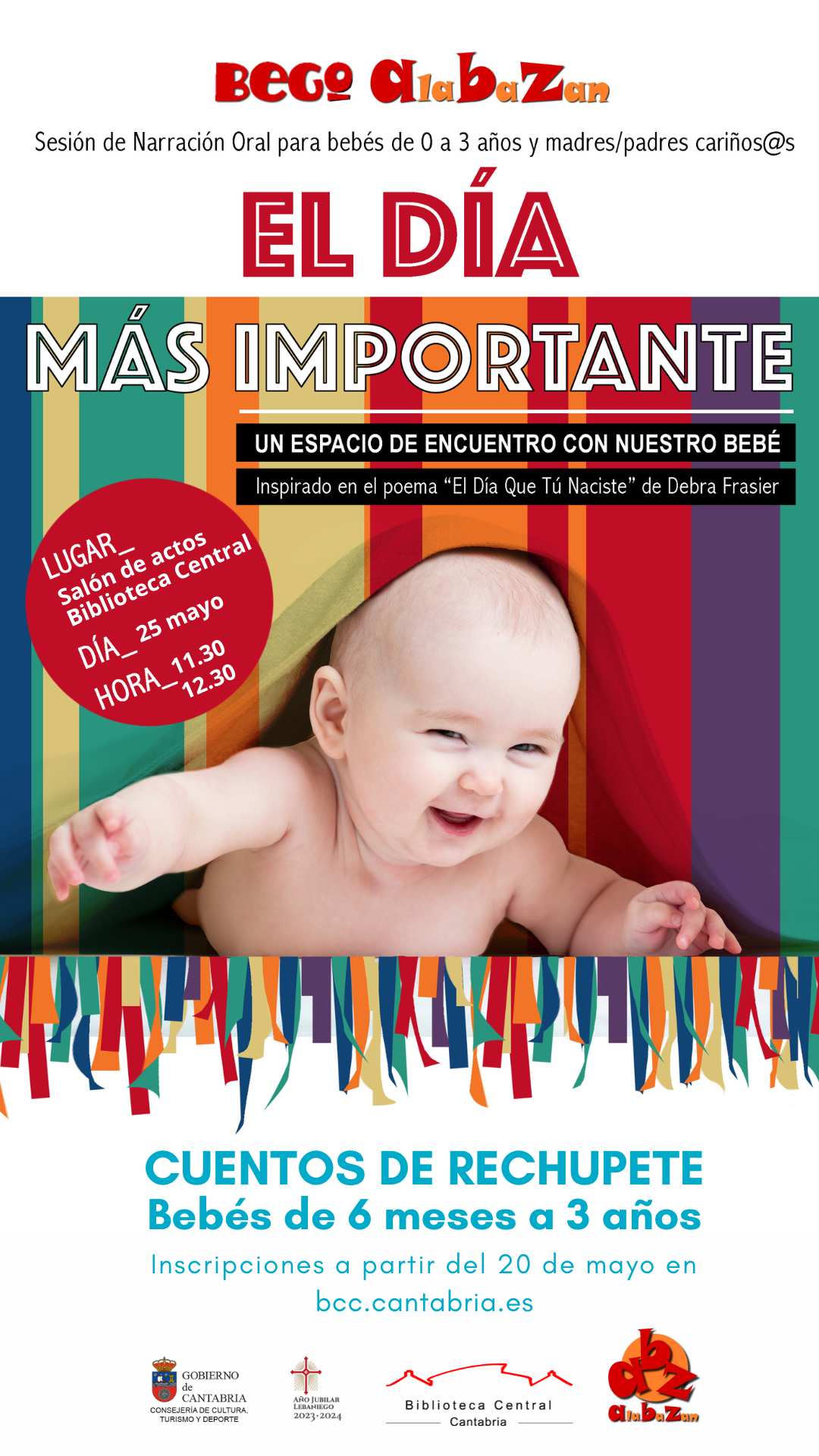 “Cuentos de rechupete” para bebés de 6 meses a 3 años, el 25 mayo en la Biblioteca Central de Cantabria. Habrá dos sesiones, a las 11.30 y 12.30 horas. Inscripciones a partir del 20 de mayo a través de la página web https://bcc.cantabria.es/ .