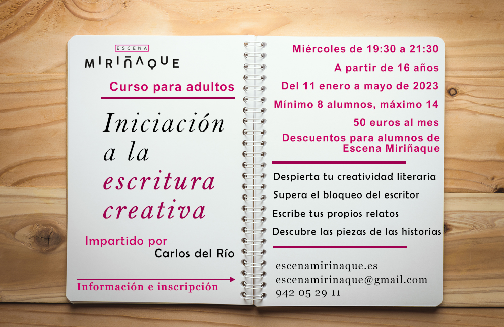 Escena Miriñaque ofrece un curso de iniciación a la escritura creativa impartido por Carlos del Río, profesor de escritura creativa con más de 8 años de experiencia. Las clases se impartirán los miércoles de 19:30 a 21:30h, desde el 11 de enero al 24 de mayo.