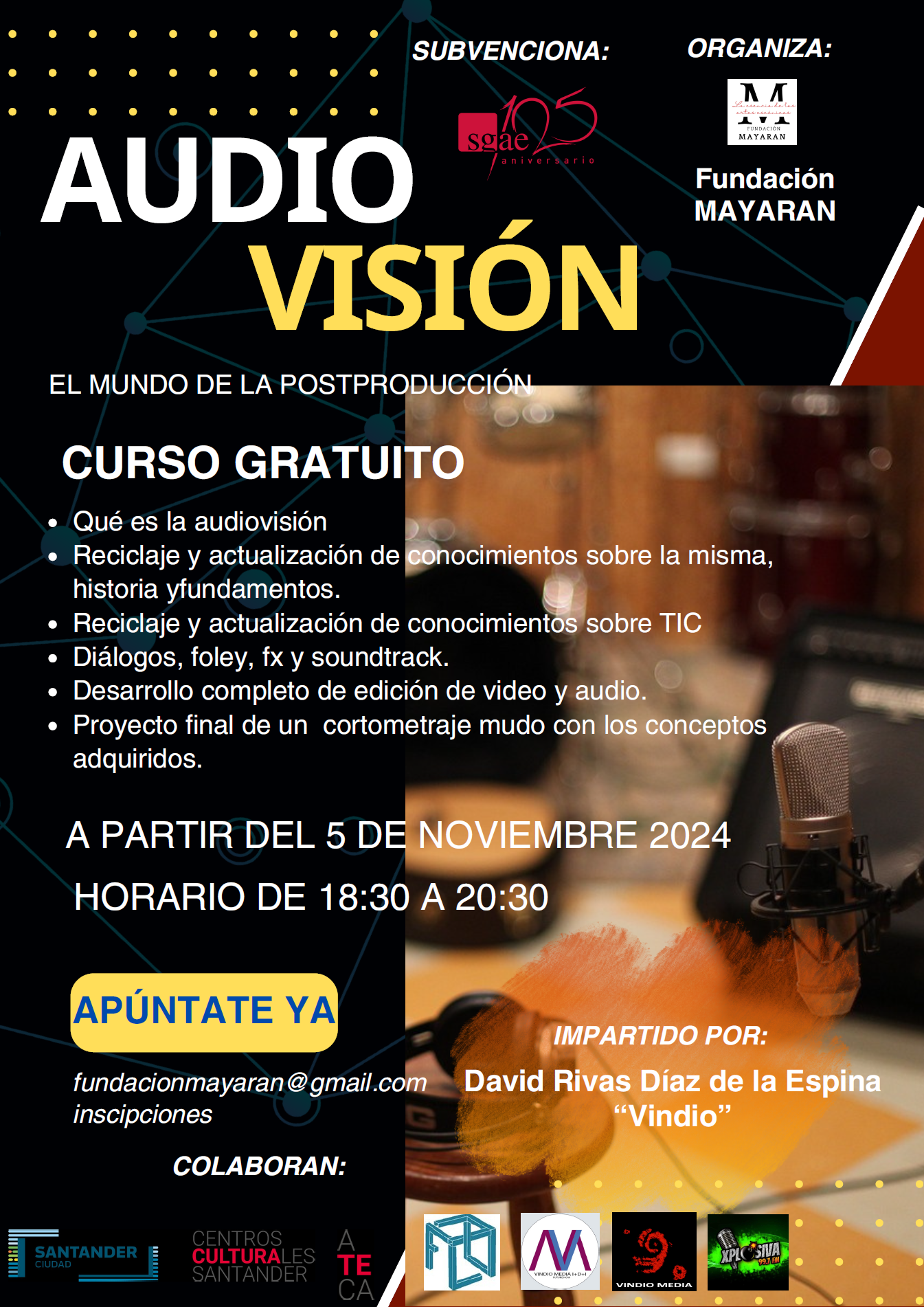 La Fundación Mayaran, en colaboración con el prestigioso proyecto SGAE ACTÚA, ha anunciado la apertura de inscripciones para el curso "Audiovisión", una formación innovadora que combina las Tecnologías de la Información y la Comunicación (TICs) con el arte de la postproducción musical y audiovisual. El curso, que será impartido por el reconocido compositor y productor David Rivas Díaz de la Espina, “Vindio”, está dirigido a todos aquellos interesados en adquirir conocimientos prácticos y modernos en estos campos.