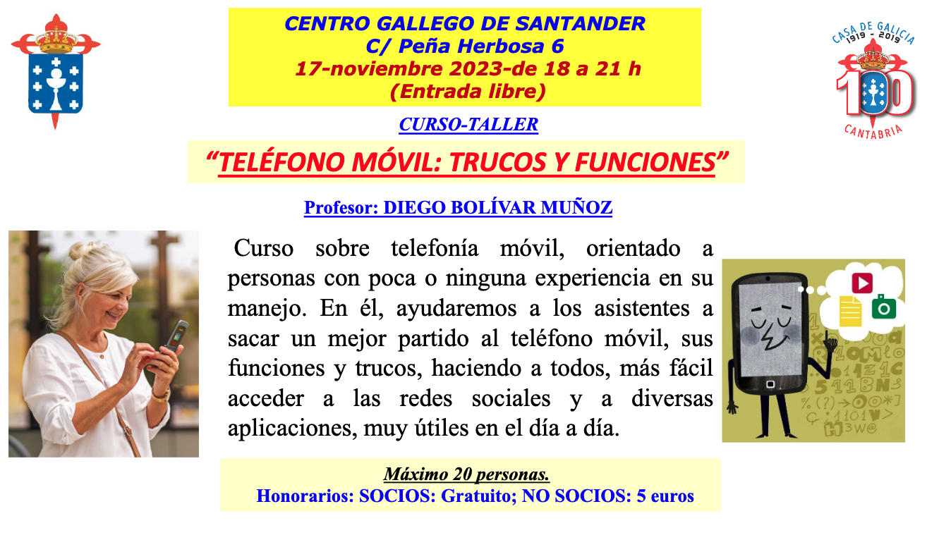 El viernes 17 de noviembre de 18:00 a 21:00 horas el Centro Gallego de Santander ofrece el taller “Teléfono móvil: trucos y funciones”, que impartirá Diego Bolívar Muñoz