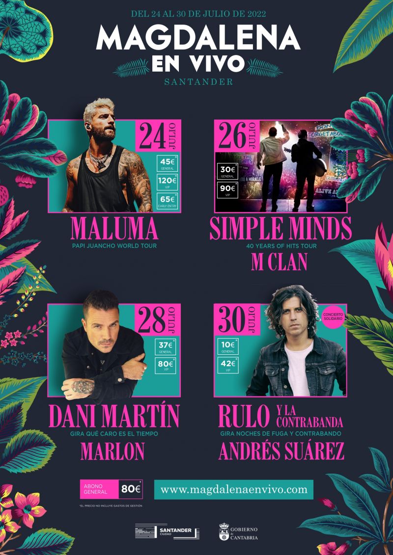 La tercera jornada del festival Magdalena en Vivo 2022 se celebrará el jueves 28 de julio y contará con los conciertos de Dani Martín y Marlon. El músico madrileño cumple 20 años de carrera sobre los escenarios y aprovechará esta nueva gira para repasar en directo todos sus éxitos, entre los que incluirá una selección de los temas de siempre de El Canto del Loco, la banda que lo dio a conocer en sus inicios.