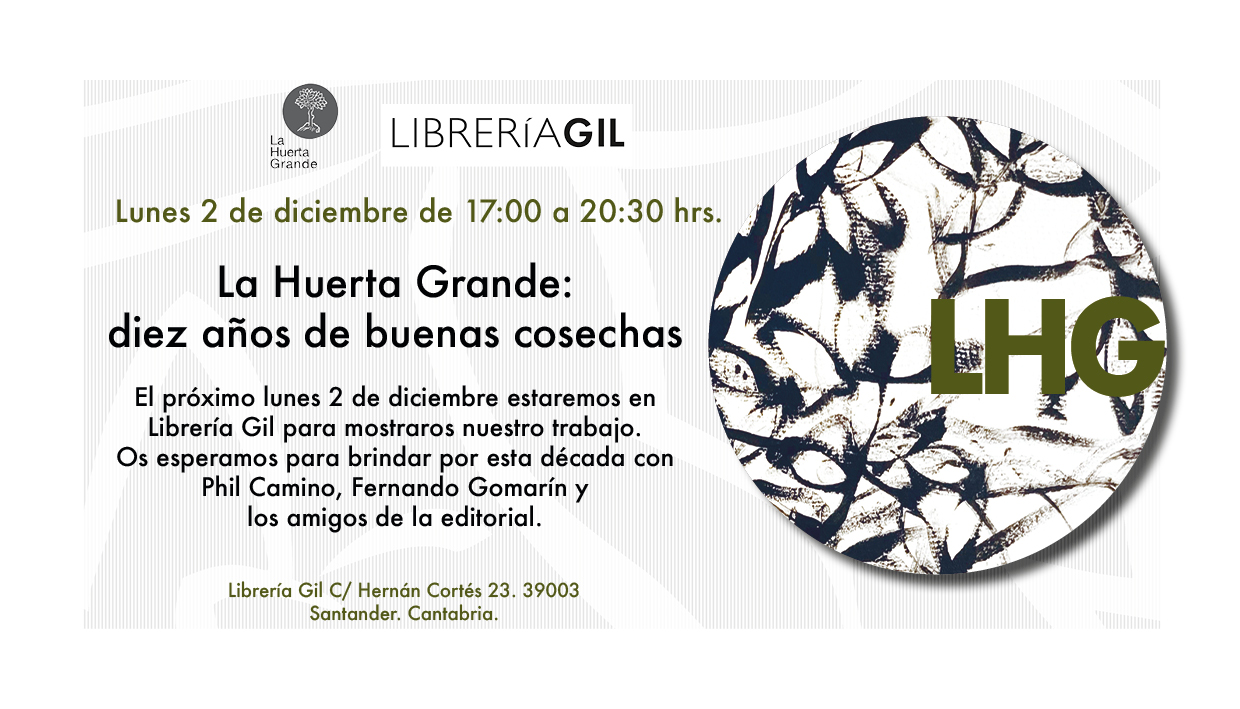 El lunes 2 de diciembre, de 17:00 a 20:30 h., se celebra el décimo aniversario de la editorial La Huerta Grande. Phil Camino, Fernando Gomarín y los amigos de la editorial conversarán sobre esta década de trabajo repleta de buenas cosechas.
