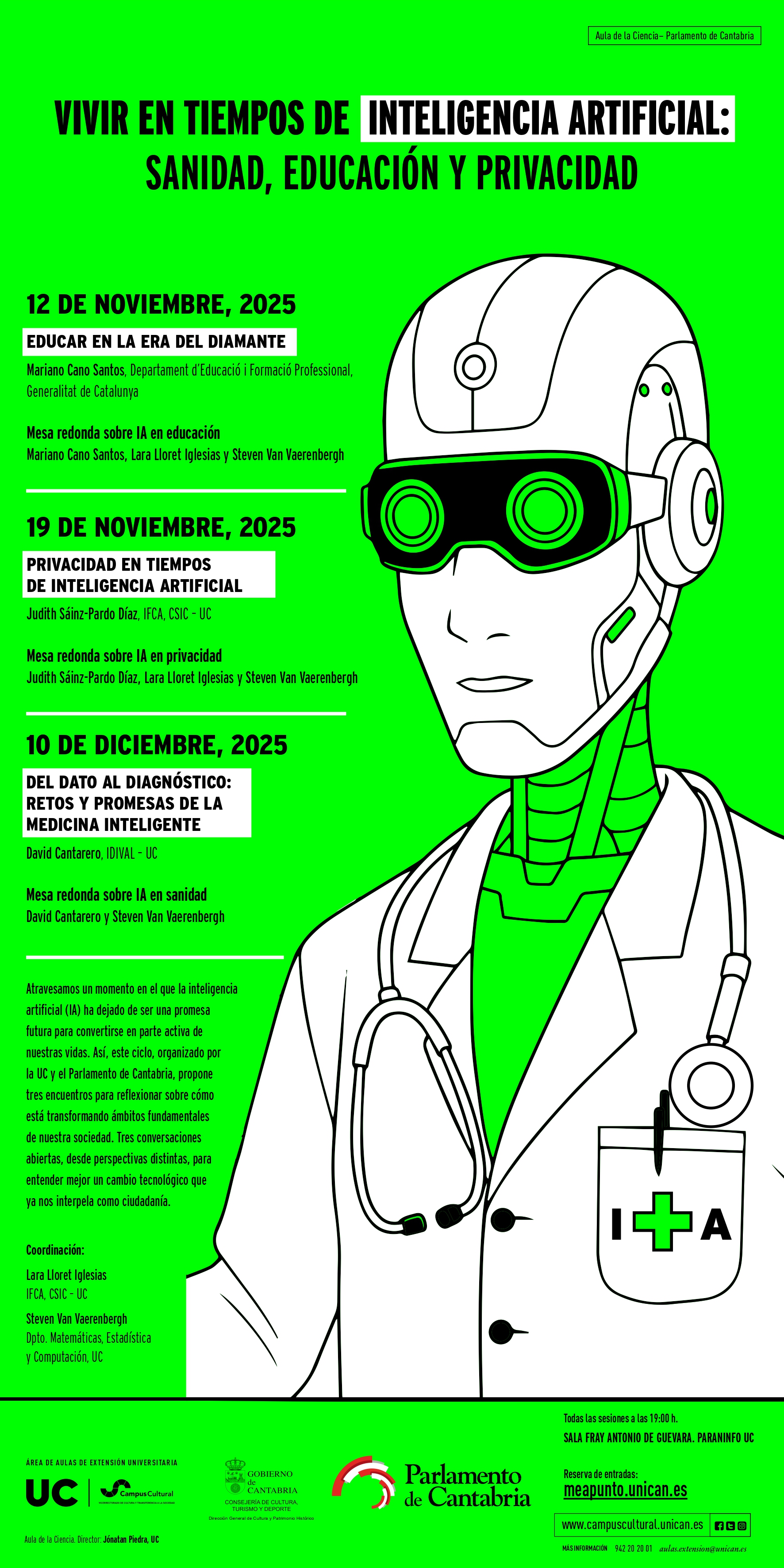 Atravesamos un momento en el que la inteligencia artificial (IA) ha dejado de ser una promesa futura para convertirse en parte activa de nuestras vidas. Así, este ciclo, organizado por la UC y el Parlamento de Cantabria, propone tres encuentros para reflexionar sobre cómo está transformando ámbitos fundamentales de nuestra sociedad. Tres conversaciones abiertas, desde perspectivas distintas, para entender mejor un cambio tecnológico que ya nos interpela como ciudadanía.