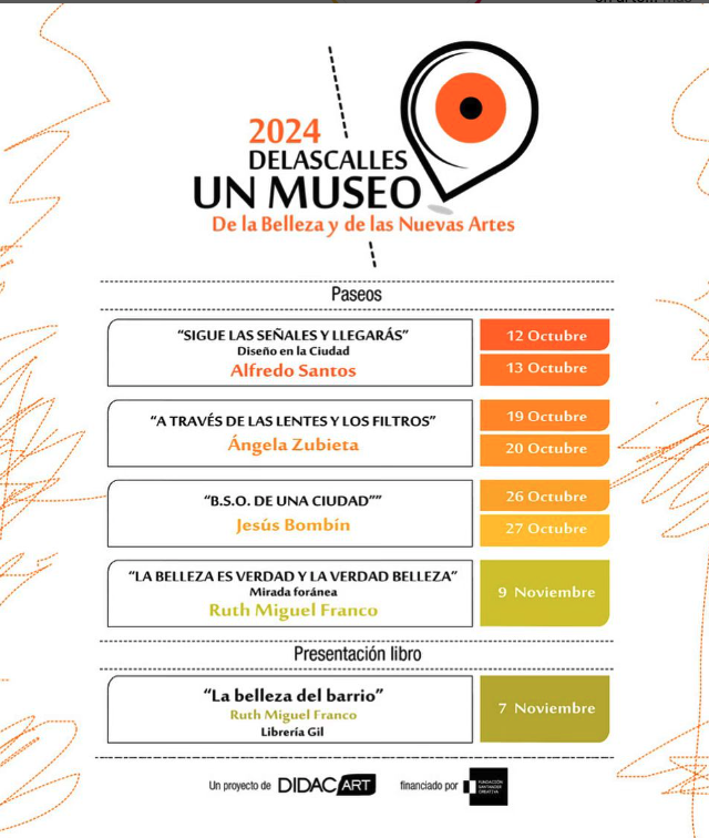 La iniciativa DelasCallesunMUSEO ofrece seis nuevos paseos por la ciudad -de octubre a diciembre- para explorar nuestro entorno desde expresiones artísticas más populares como pueden ser el diseño gráfico, la música o la fotografía y abordar el concepto de belleza en lo cotidiano. De hecho, el leitmotiv de este año es este: “De la Belleza y de las Nuevas Artes”. Qué es, dónde encontrarla, cómo hallarla en nuestro día a día, cómo distinguirla en lo ordinario.
