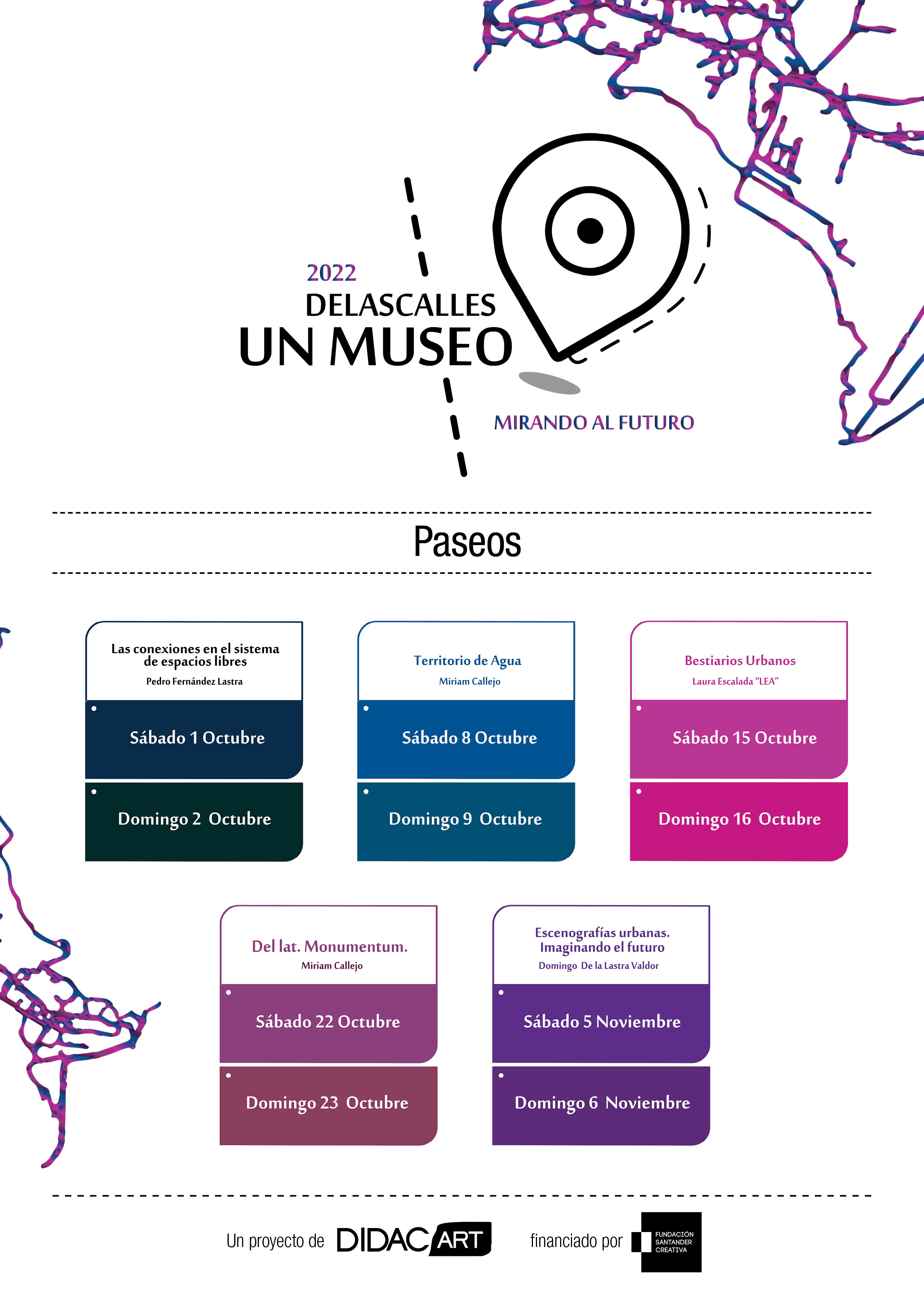 El proyecto “DelasCallesunMUSEO” abordará cinco nuevos paseos, con dos sesiones cada uno de ellos, para recorrer diferentes espacios de la ciudad de Santander durante los fines de semana de octubre y noviembre. Cada paseo contará con un máximo de 20 plazas. La inscripción es gratuita a través de la web www.didacart.com , a partir del 15 de septiembre, en el apartado DelasCallesunMUSEO.