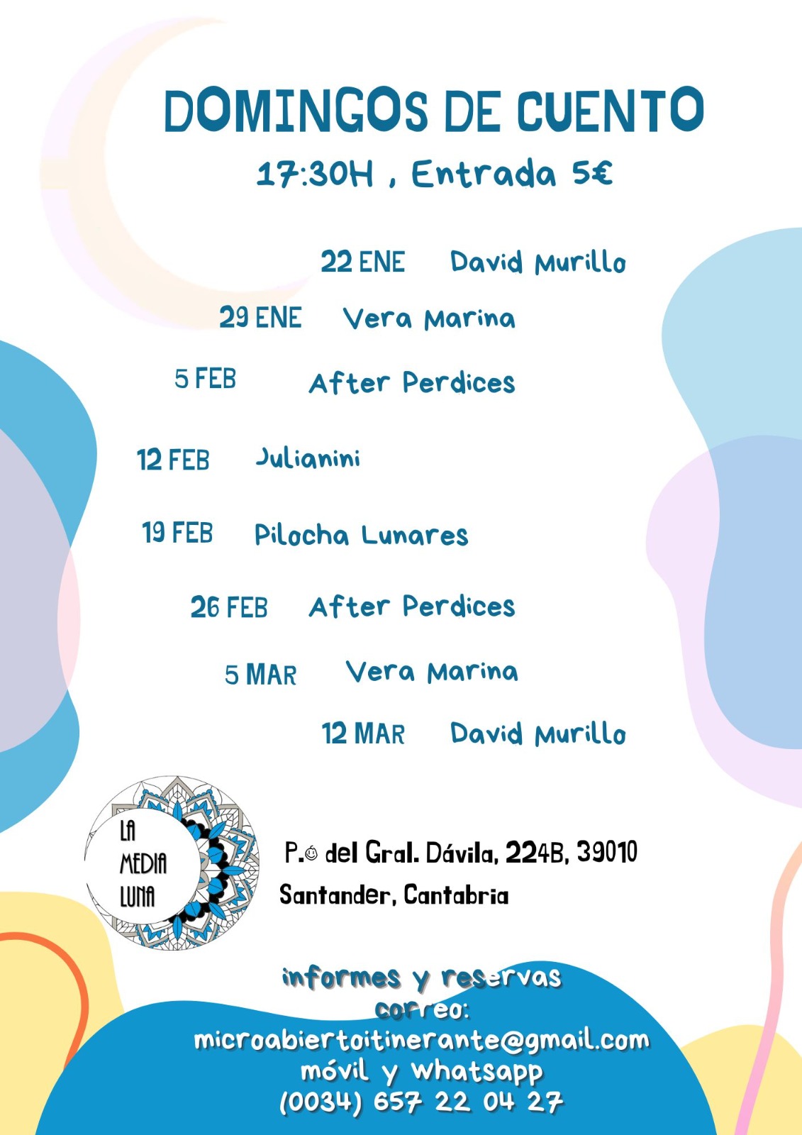 La Media Luna Espacio Artístico ofrece esta propuesta para toda la familia en la que se podrán escuchar cuentos de diferentes autores y temáticas contados por cuentacuentos residentes en Cantabria, profesionales en el arte de narrar historias y divertir a todo tipo de público.