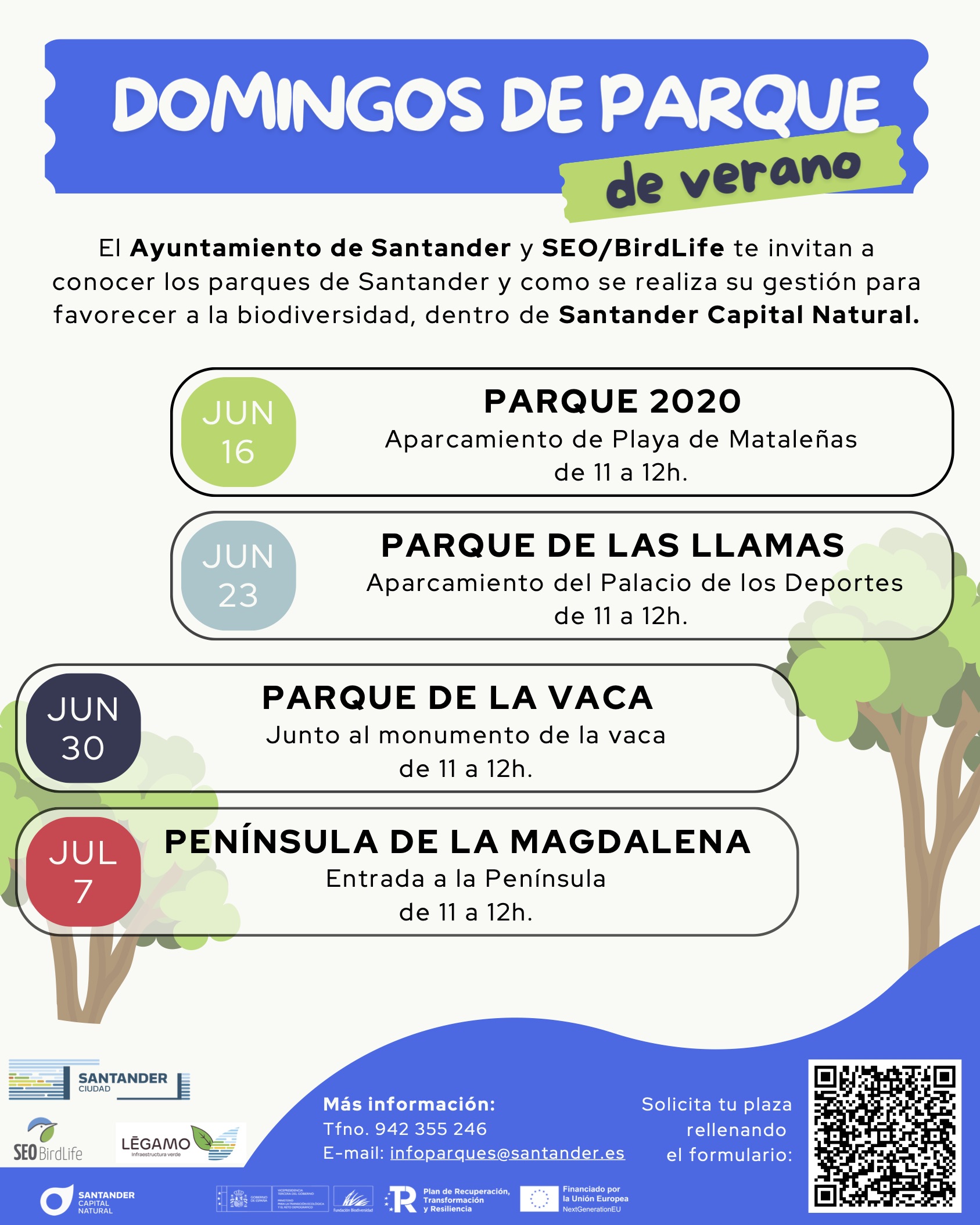 Las personas que deseen ampliar información pueden hacerlo en la web Portada - Santander Capital Natural (santandernatural.es), en el teléfono 942 355 246 o en el correo electrónico infoparques@santander.es .
