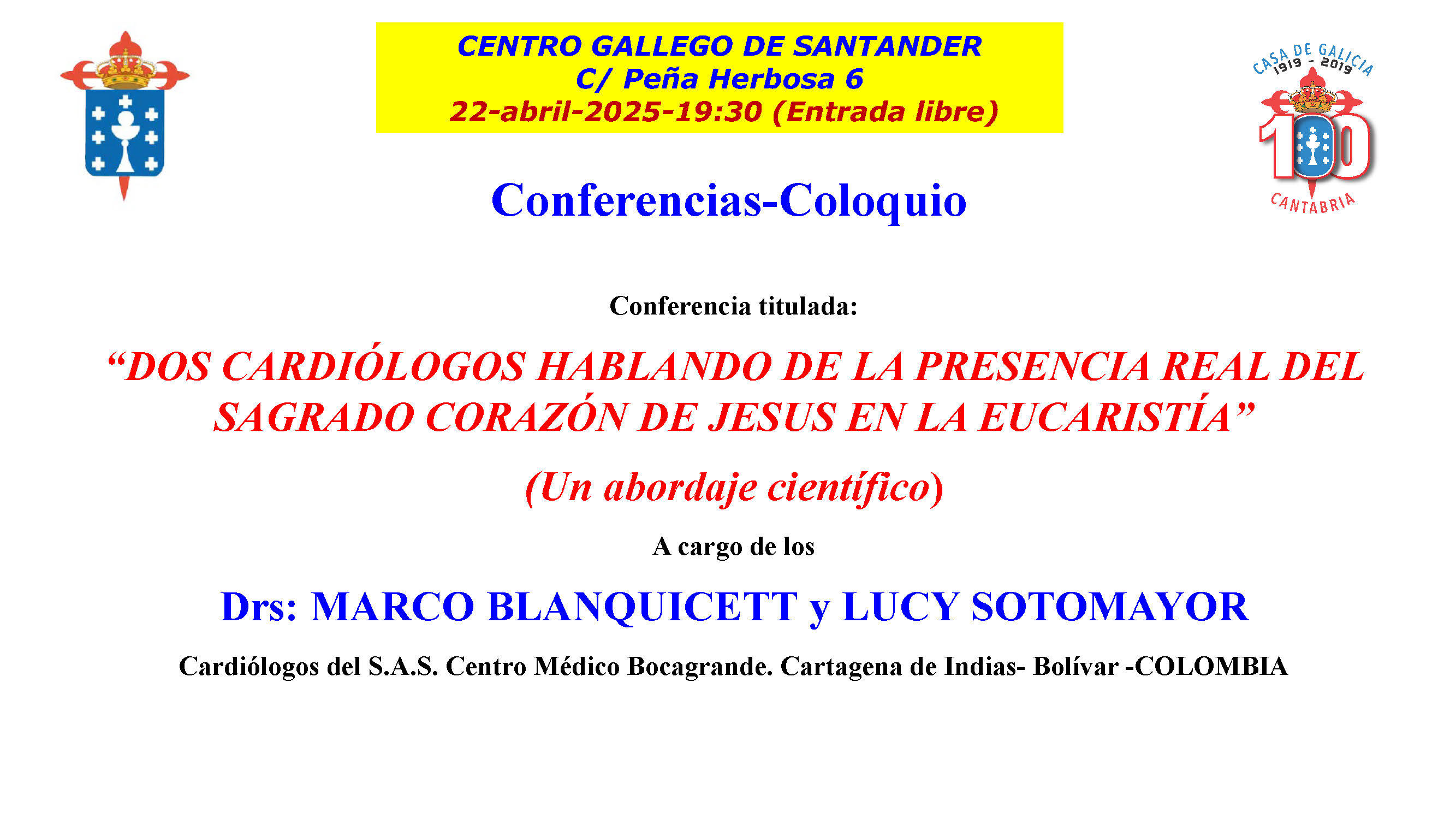 “Dos cardiólogos hablando de la presencia real del sagrado corazón de Jesús en la eucaristía” (un abordaje científico), conferencia a cargo de Marco Blanquicett y Lucy Sotomayor, cardiólogos del S.A.S. Centro Médico Bocagrande de Cartagena de Indias.