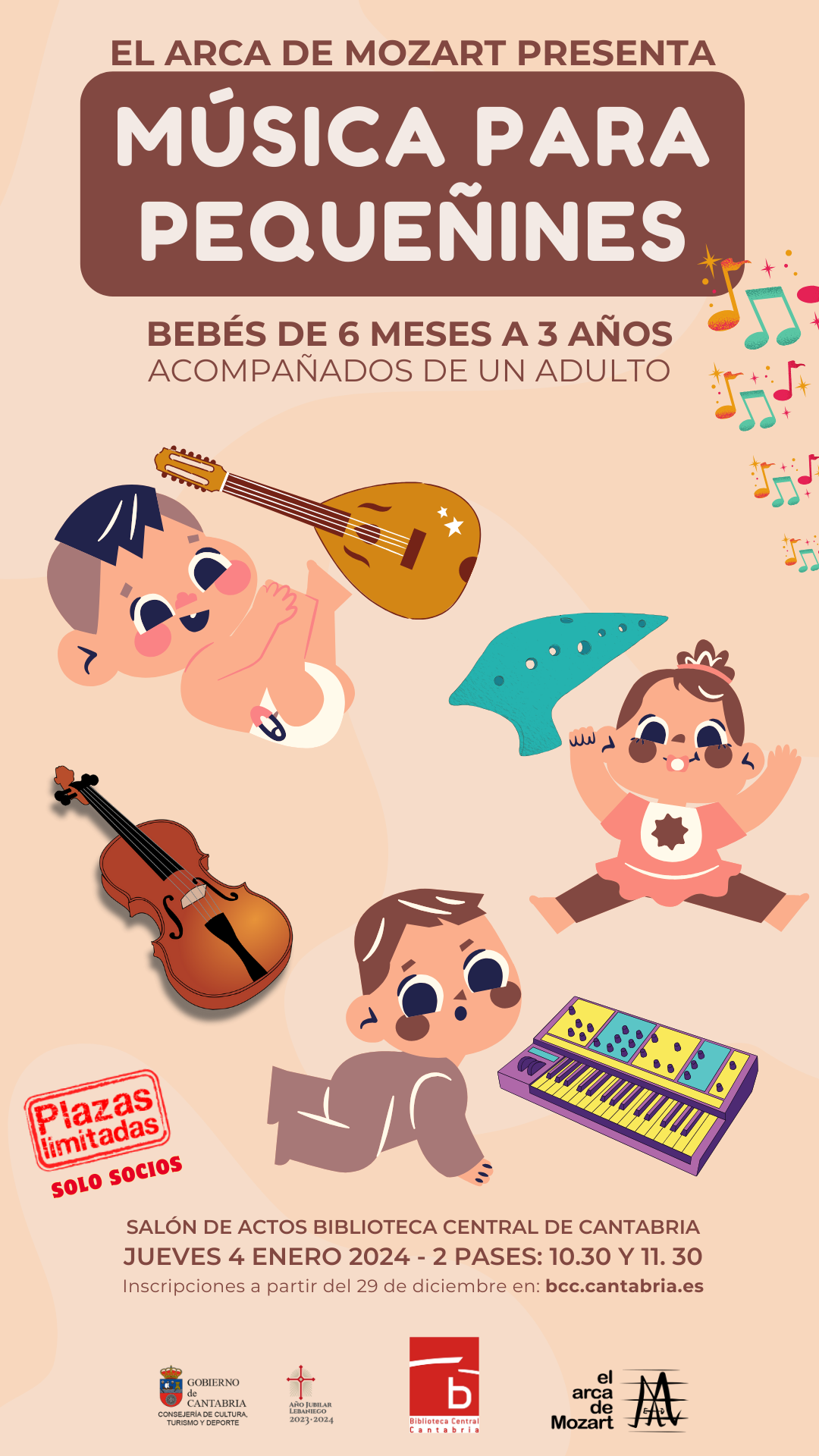 El Arca de Mozart ofrece en la Biblioteca Central de Cantabria esta actividad dirigida a bebés de 6 meses a 3 años. Se desarrollará el jueves 4 de enero, en dos pases, a las 10:30 y 11:30 h. Inscripciones a partir del 29 de diciembre en la página web de la BCC.