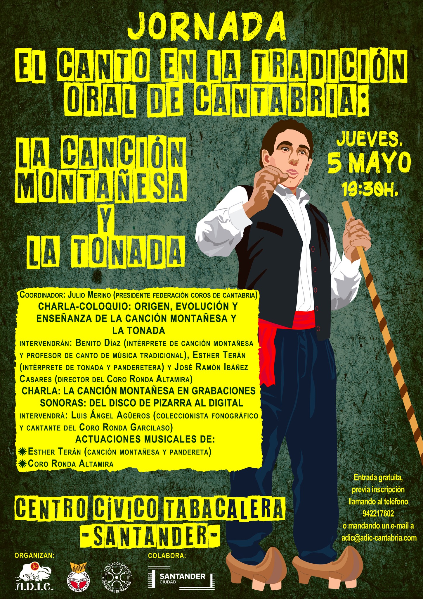 El día 5 de mayo tendrá lugar la jornada "El canto en la tradición oral de Cantabria: la Canción Montañesa y la Tonada" en el salón de actos del Centro Cívico Tabacalera a las 19:30h. Un evento organizado por la Asociación ADIC, la Federación de Coros de Cantabria y la Federación de Agrupaciones de Folclore de Cantabria.