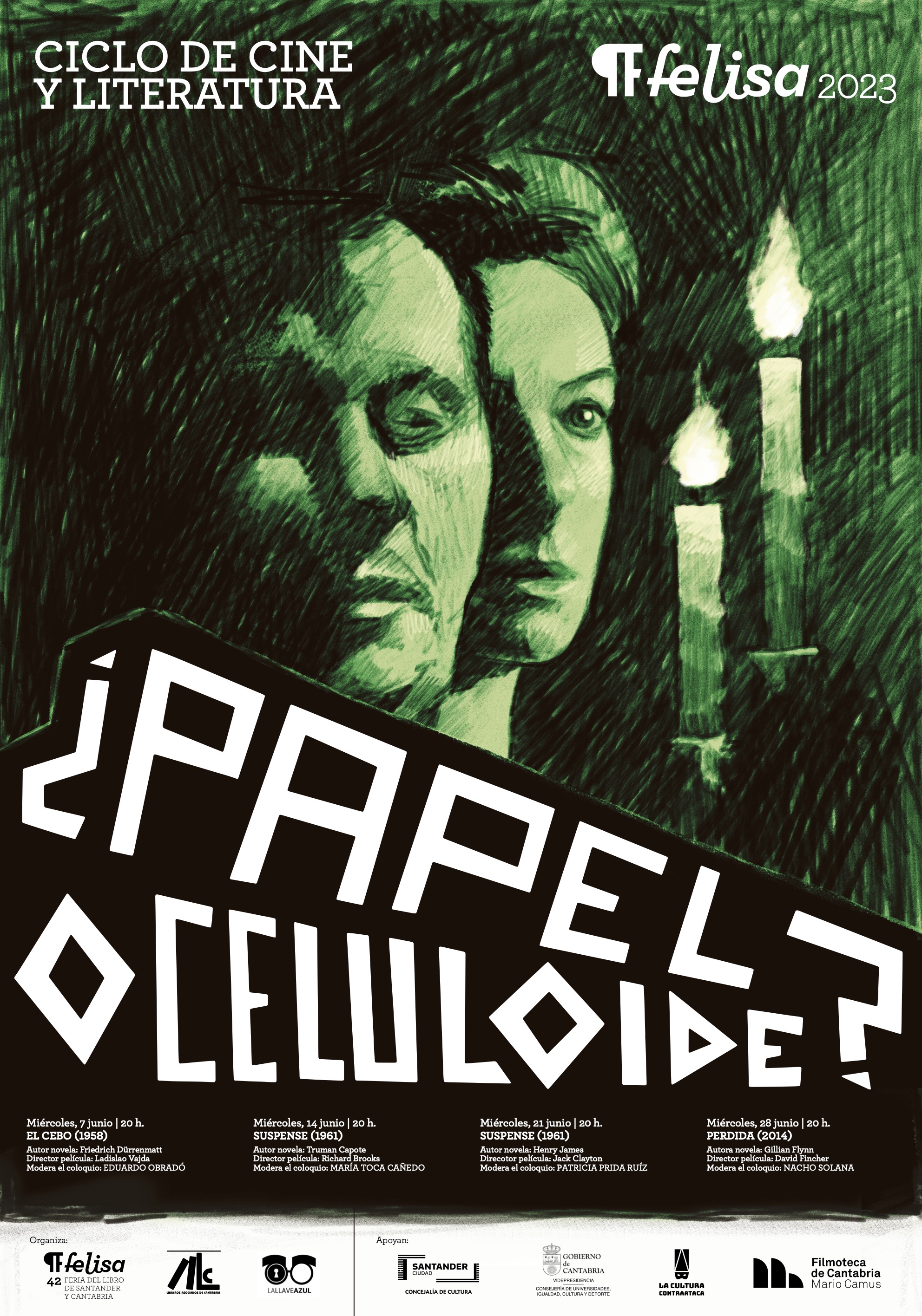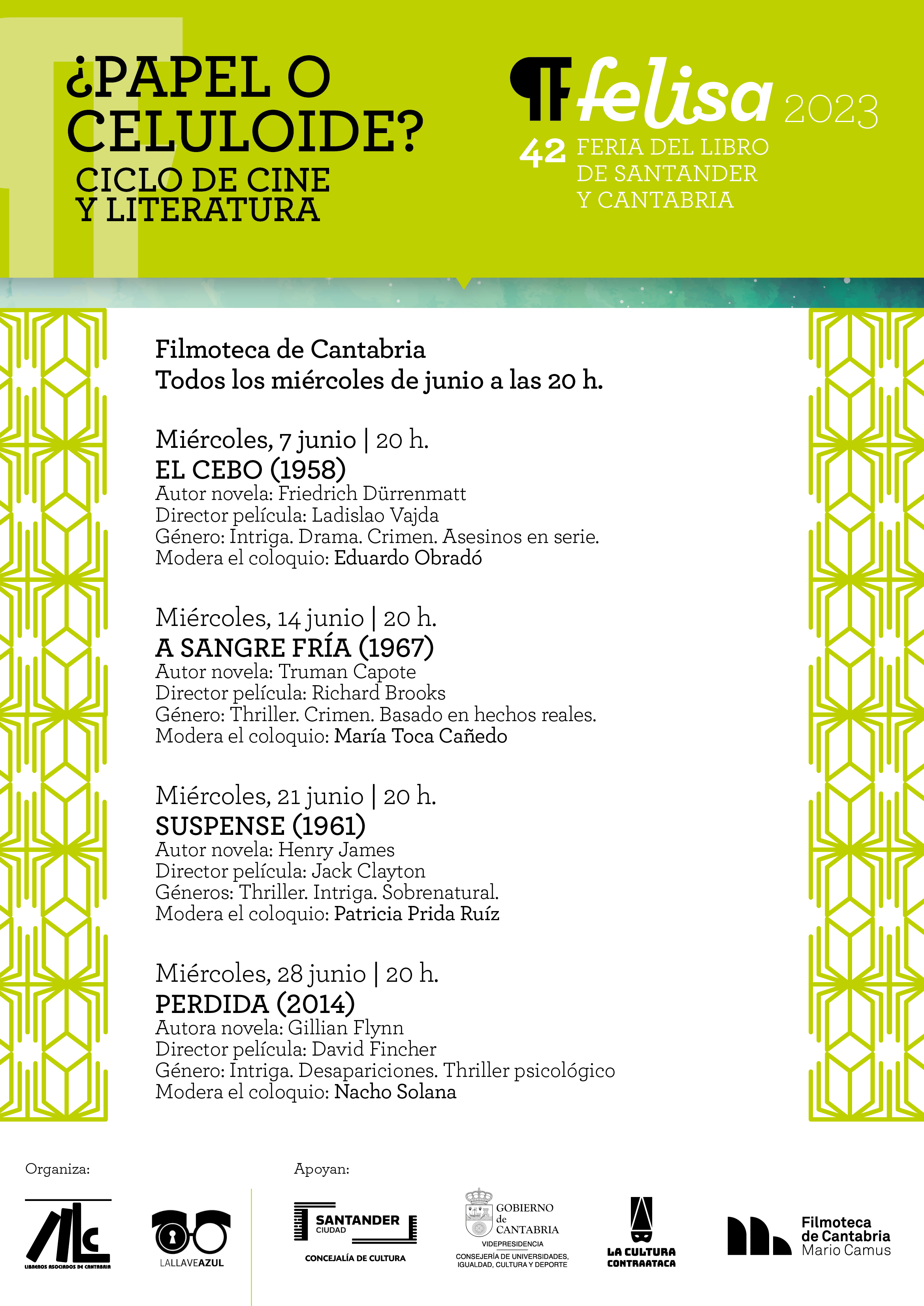 El ciclo está organizado por Felisa 2023 en alianza con la Filmoteca de Cantabria y la asociación La Llave Azul. Durante cuatro miércoles se podrán ver las películas “El cebo” (1958), “A sangre fría” (1967), “Suspense” (1961), “Perdida” (2014), todas las cintas con un fuerte carácter de thriller. Cada cita será conducida por una persona experta que ayudará a entender la relación entre el texto literario y su adaptación al lenguaje cinematográfico. Las cuatro personas invitadas son Eduardo Obradó Mancholas, María Toca, Patricia Prida y Nacho Solana.