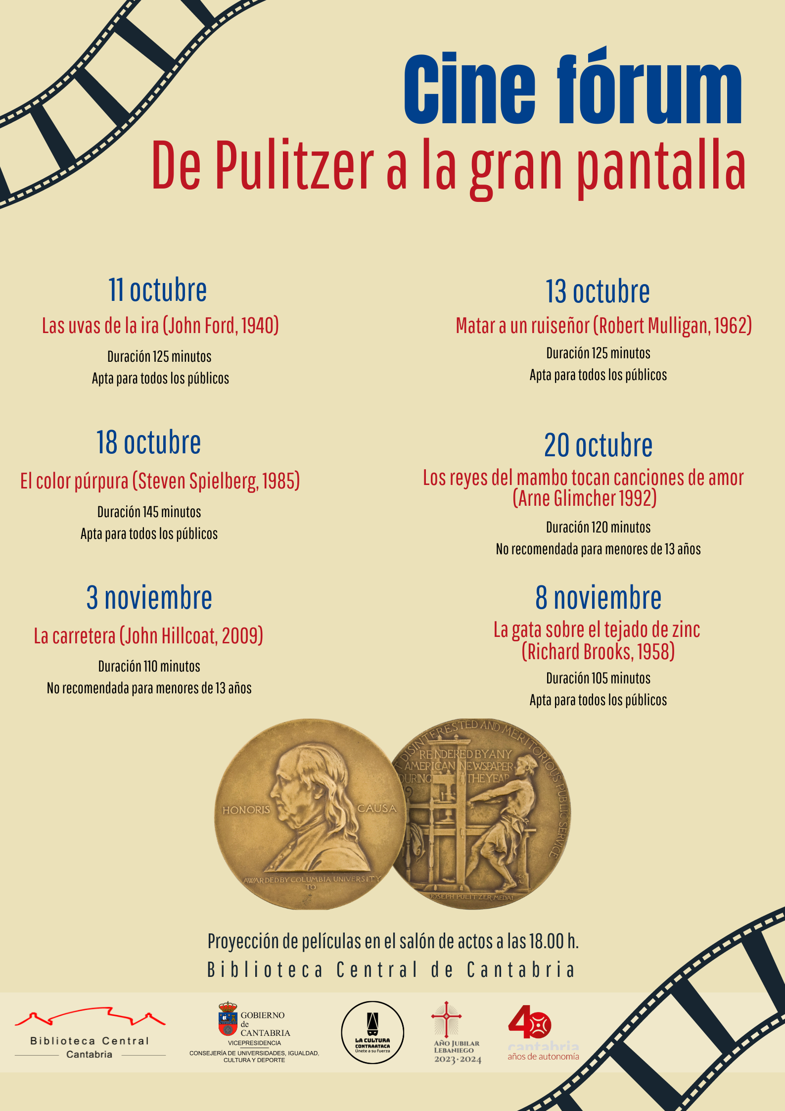La Biblioteca Central de Cantabria propone una selecta y curiosa selección de los muchos filmes que el cine ha basado en los premios Pulitzer, componiendo cintas llenas de emoción, mensajes cautivadores y conmovedoras historias sobre la condición humana.