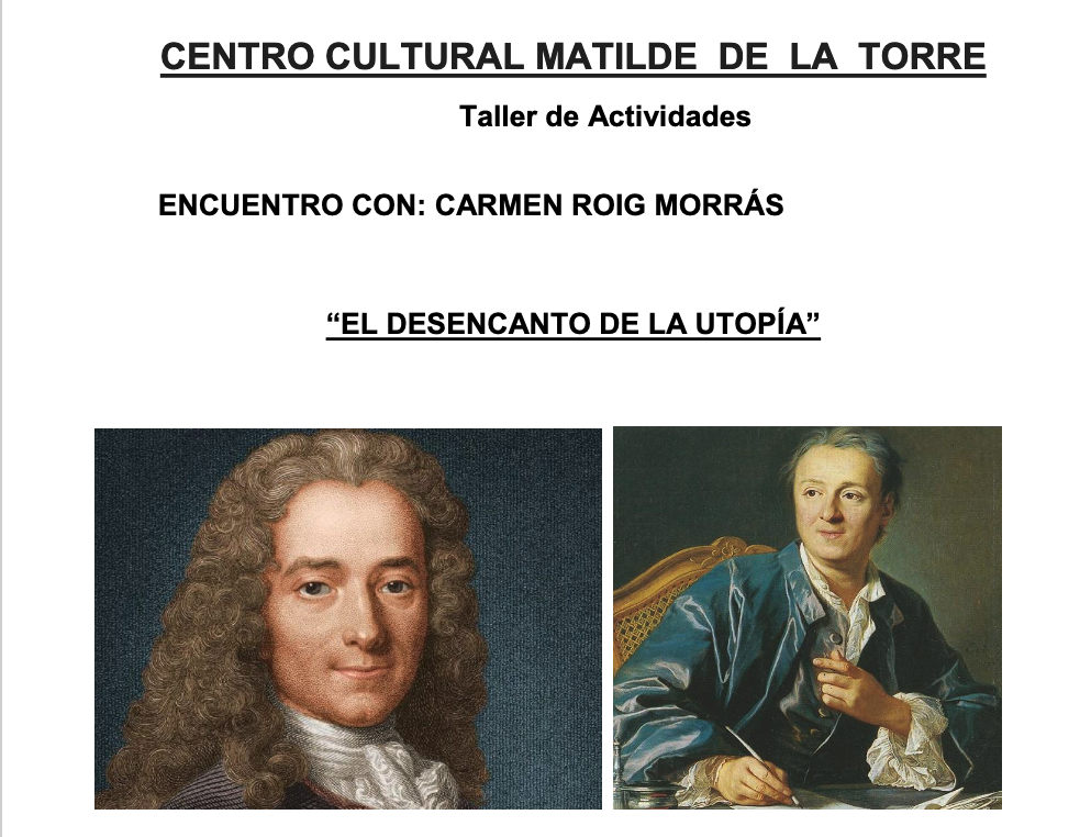 El miércoles 7 de mayo, a las 18:00 horas, en el taller de Actividades del Centro Cultural Matilde de la Torre tendrá lugar el encuentro con Carmen Roig Morrás, Profesora Titular de Filología Francesa de la Universidad de Cantabria, jubilada, quien hablará a los asistentes sobre “El desencanto de la utopía”.