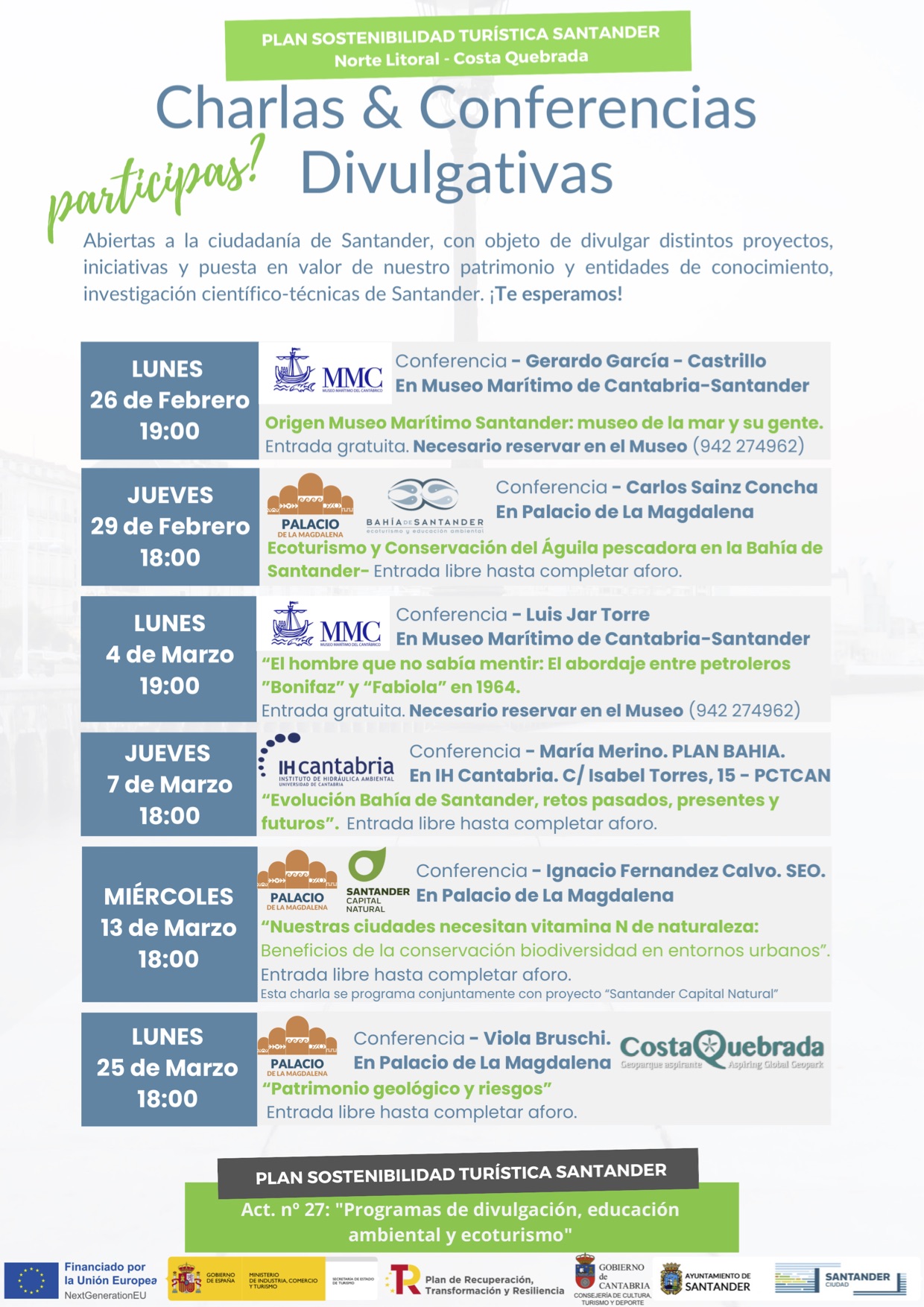 En el marco del Plan de Sostenibilidad, concretamente de su actuación “Programas de divulgación, educación ambiental y ecoturismo”, se ha puesto en marcha un programa de charlas divulgativas en diversos espacios de Santander, y en colaboración con distintas entidades y organizaciones, abiertas a la ciudadanía.