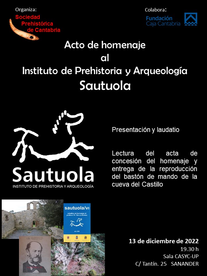 El martes 13 de diciembre, a las 19.30 h. en CASYC-UP (Fundación Caja Cantabria), la Sociedad Prehistórica de Cantabria hará entrega de su Premio de Honor, la reproducción en bronce del bastón de mando de la cueva de El Castillo, al Instituto de Prehistoria y Arqueología «Sautuola».