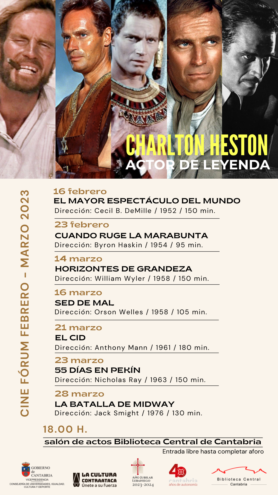 En 2023 se cumple el centenario del nacimiento de una de las grandes leyendas del cine, Charlton Heston. La BCC le dedica un ciclo en el que se proyectarán siete películas imprescindibles en su filmografía.