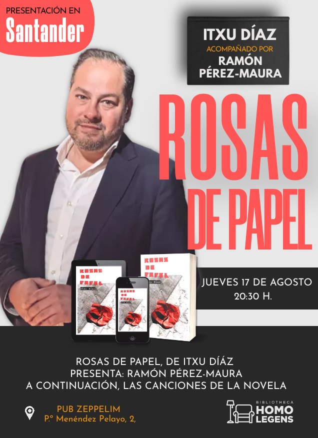 El periodista y escritor coruñés Itxu Díaz (La Coruña, 1981) presentará Rosas de papel (Homo Legens, 2023) el jueves 17 de agosto en Santander. Se trata del undécimo libro del autor, pero su primera novela. La presentación cántabra será en el pub Zeppelin (Pº Menéndez Pelayo), y correrá a cargo del periodista santanderino Ramón Pérez-Maura, en un acto al que seguirá una sesión con las canciones del pop español que figuran en la novela, así como otras la banda sonora del libro del mismo autor, “Nos vimos en los bares. Una historia sentimental del pop español” (Homo Legens, 2019).