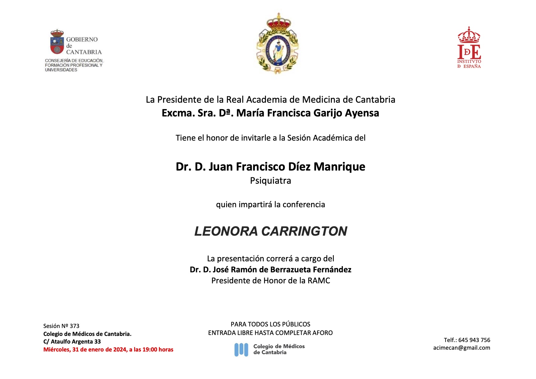 La Real Academia de Medicina de Cantabria celebra una sesión académica en la que el psiquiatra Juan Francisco Díez Manrique hablará acerca de la pintora Leonora Carrington.