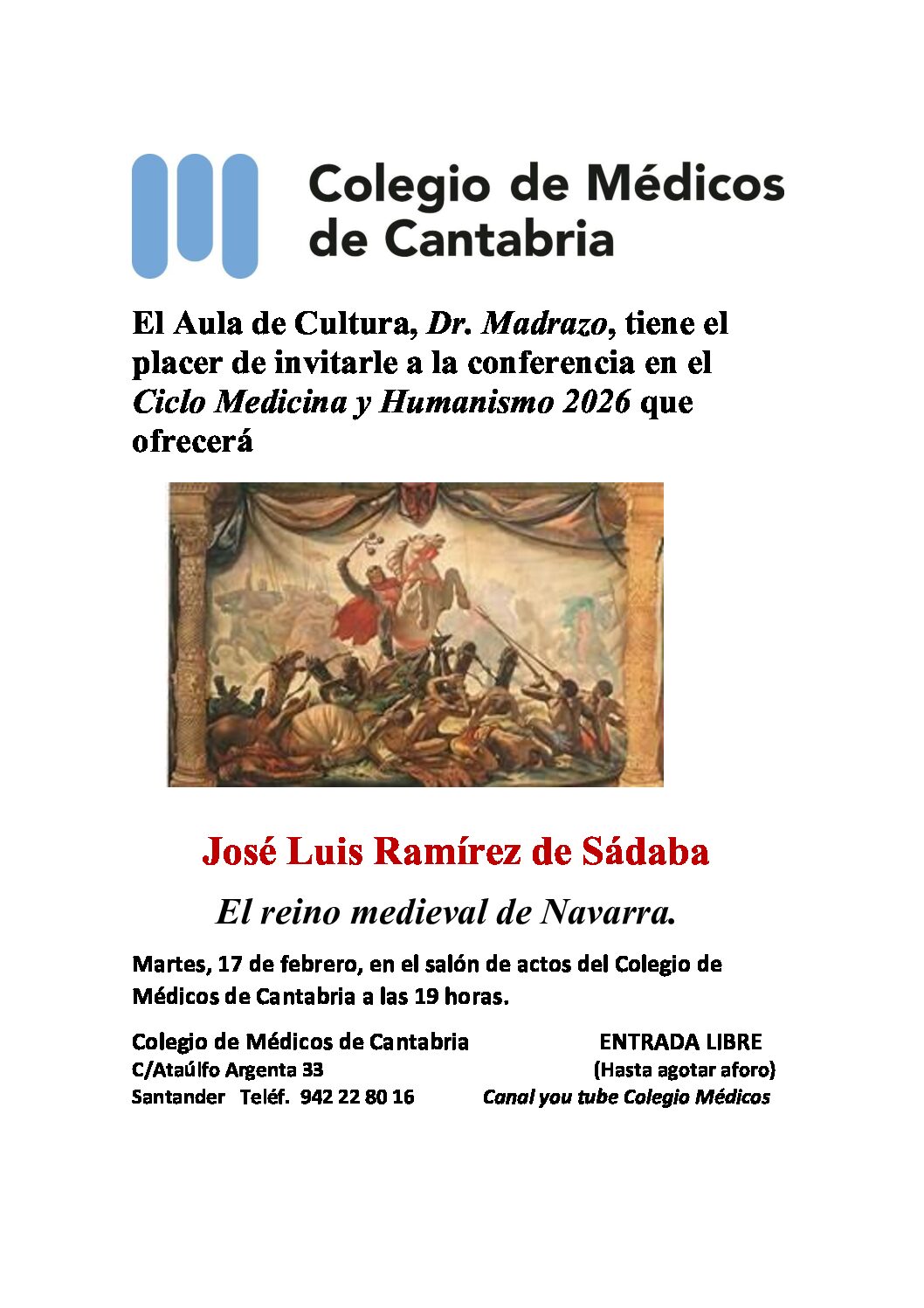 El aula de Cultura y Humanismo Dr. Madrazo del Colegio Oficial de Médicos de Cantabria, que dirige el Dr. Aurelio González-Riancho, celebra la conferencia que se celebrará el próximo martes, 17 de febrero, en la que José Luis Ramírez de Sádaba abordará “El reino medieval de Navarra”.