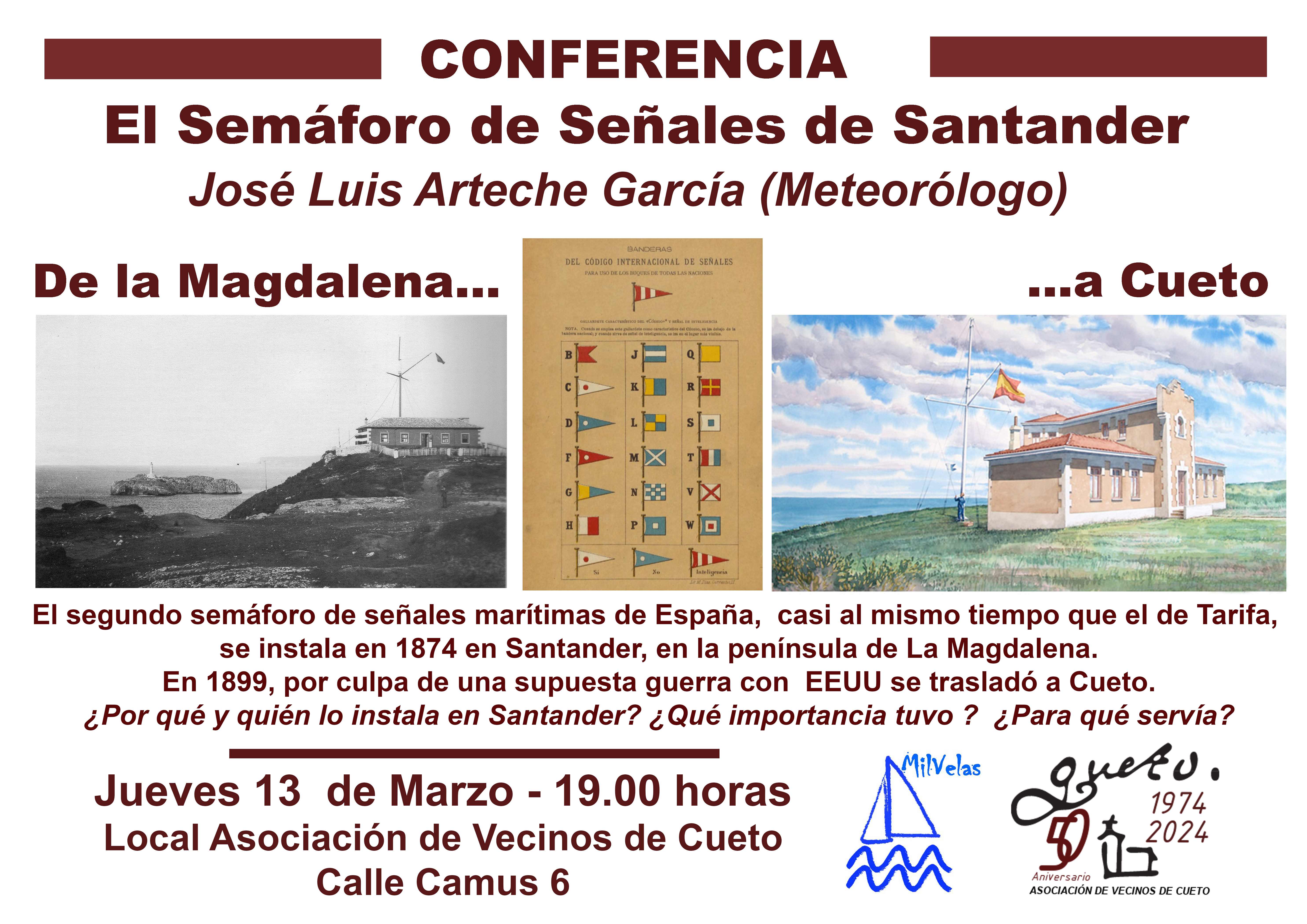 Bajo el título “El semáforo de señales de Santander, de la Magdalena a Cueto”, Jose Luis Arteche García, meteorólogo y exdirector de AEMET en Cantabria, acercará a los asistentes la historia de uno de los elementos de comunicación marítima que existieron en la ciudad de Santander, sus diferentes localizaciones y los motivos de los enclaves elegidos.