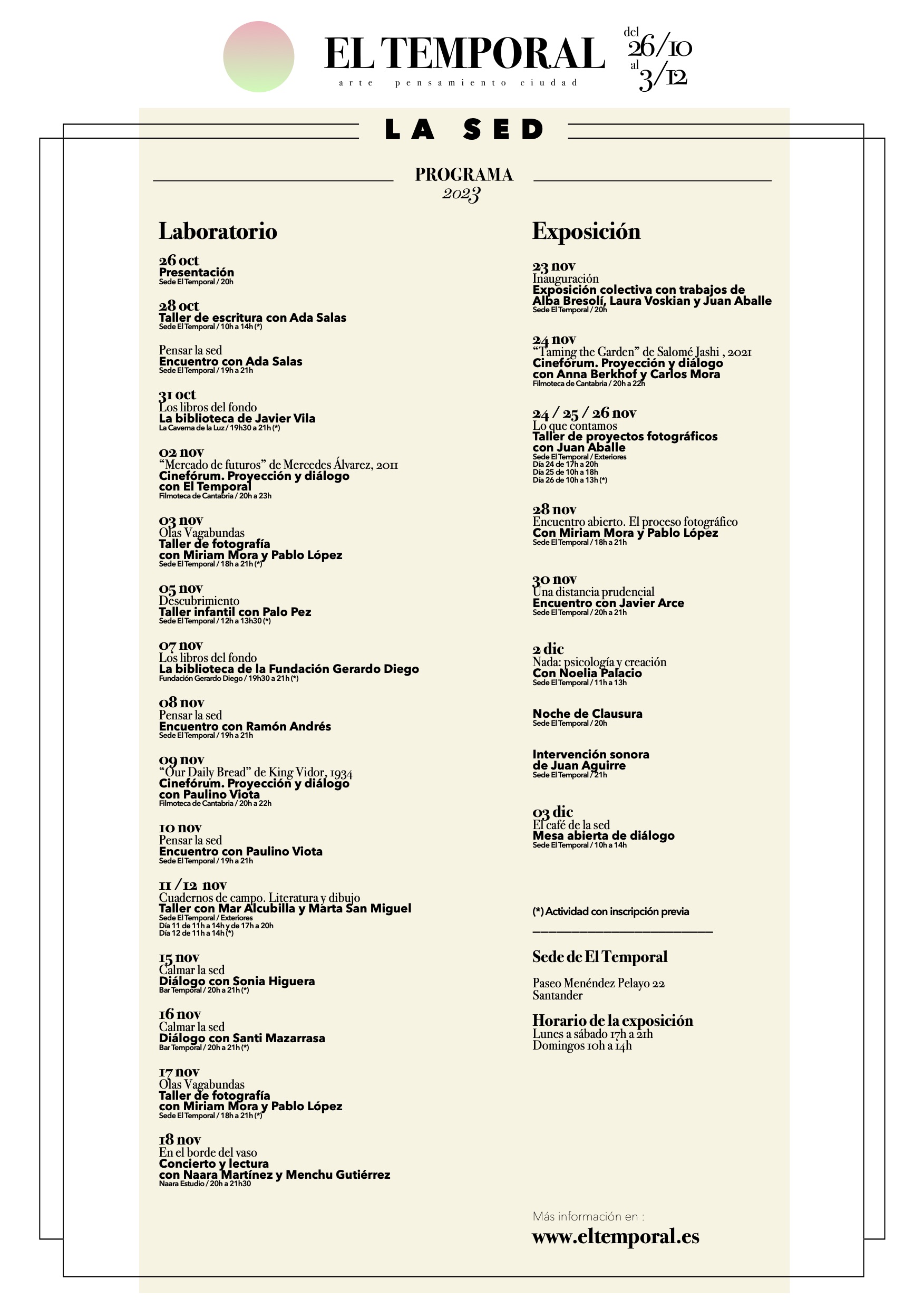 Cada año, con el comienzo del otoño, El Temporal ofrece en Santander una amplia programación alrededor del arte, la literatura, el cine y la fotografía. En su tercera edición, que arranca el próximo 26 de octubre, la sede de El Temporal albergará conferencias, talleres, encuentros con artistas y una exposición colectiva. Todo girará en torno a un mismo tema: “la sed”. Una experiencia, la de estar sedientos, que define la vida humana desde numerosos ámbitos.