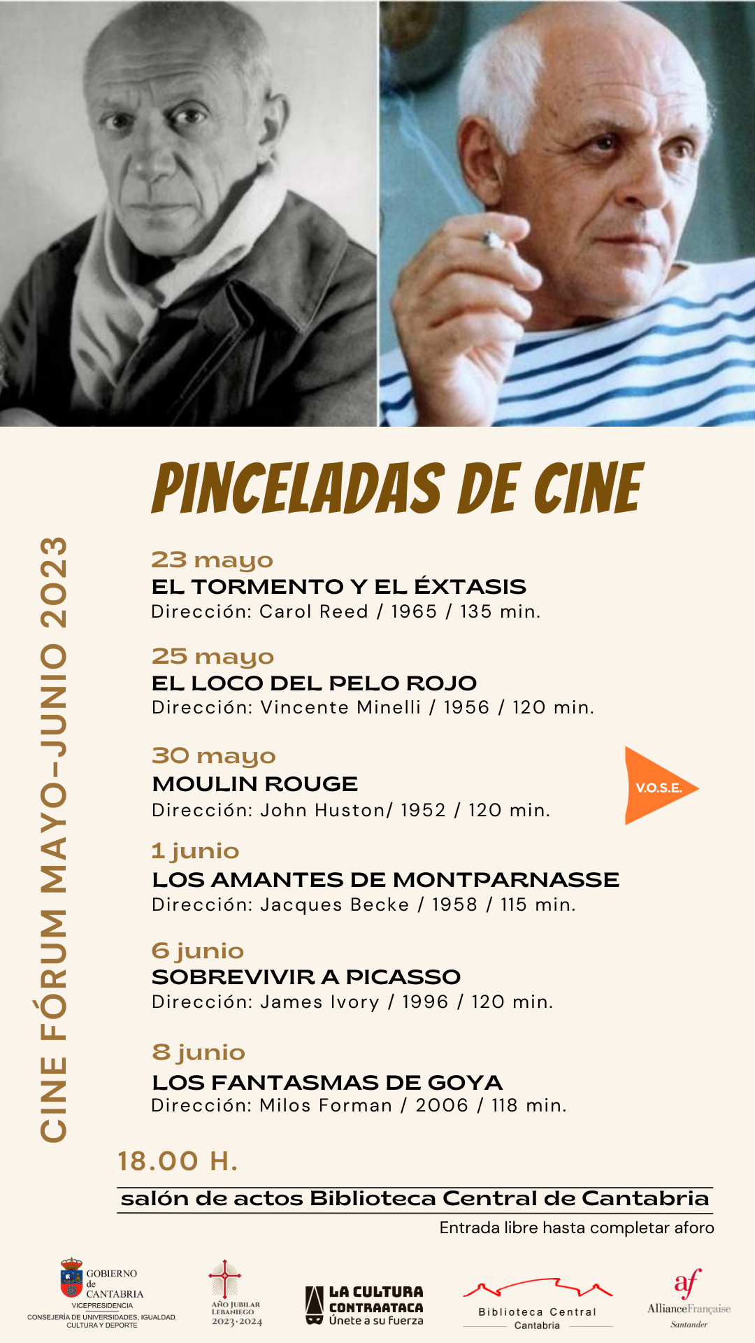 Las películas que integran este ciclo organizado por la Biblioteca Central de Cantabria pretenden acercar al espectador las vidas y obras de algunos de los grandes maestros de la historia del arte. El ciclo se enmarca en dos destacadas efemérides que se celebran este año, los 50 años de la muerte de Picasso y los 200 años de las pinturas negras de Goya, sin olvidar el siglo de la muerte de Sorolla.