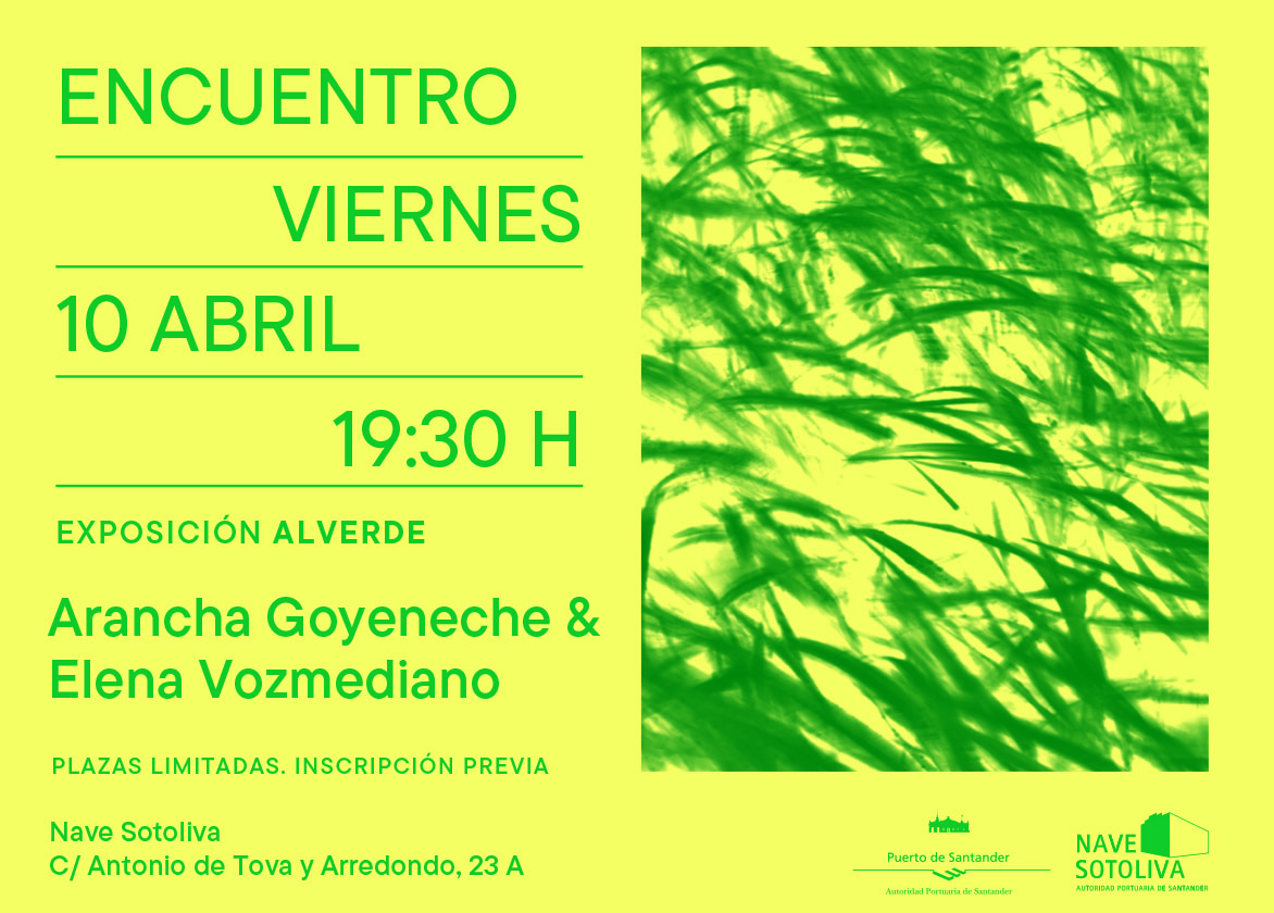 Como parte de la programación de actividades paralelas a la exposición AlVerde, la Nave Sotoliva acoge este viernes 10 de abril, a partir de las 19:30 horas, un encuentro con Arancha Goyeneche y Elena Vozmediano. La actividad, con aforo limitado e inscripción previa obligatoria, se concibe como un diálogo en torno a la exposición, con la participación del público asistente.