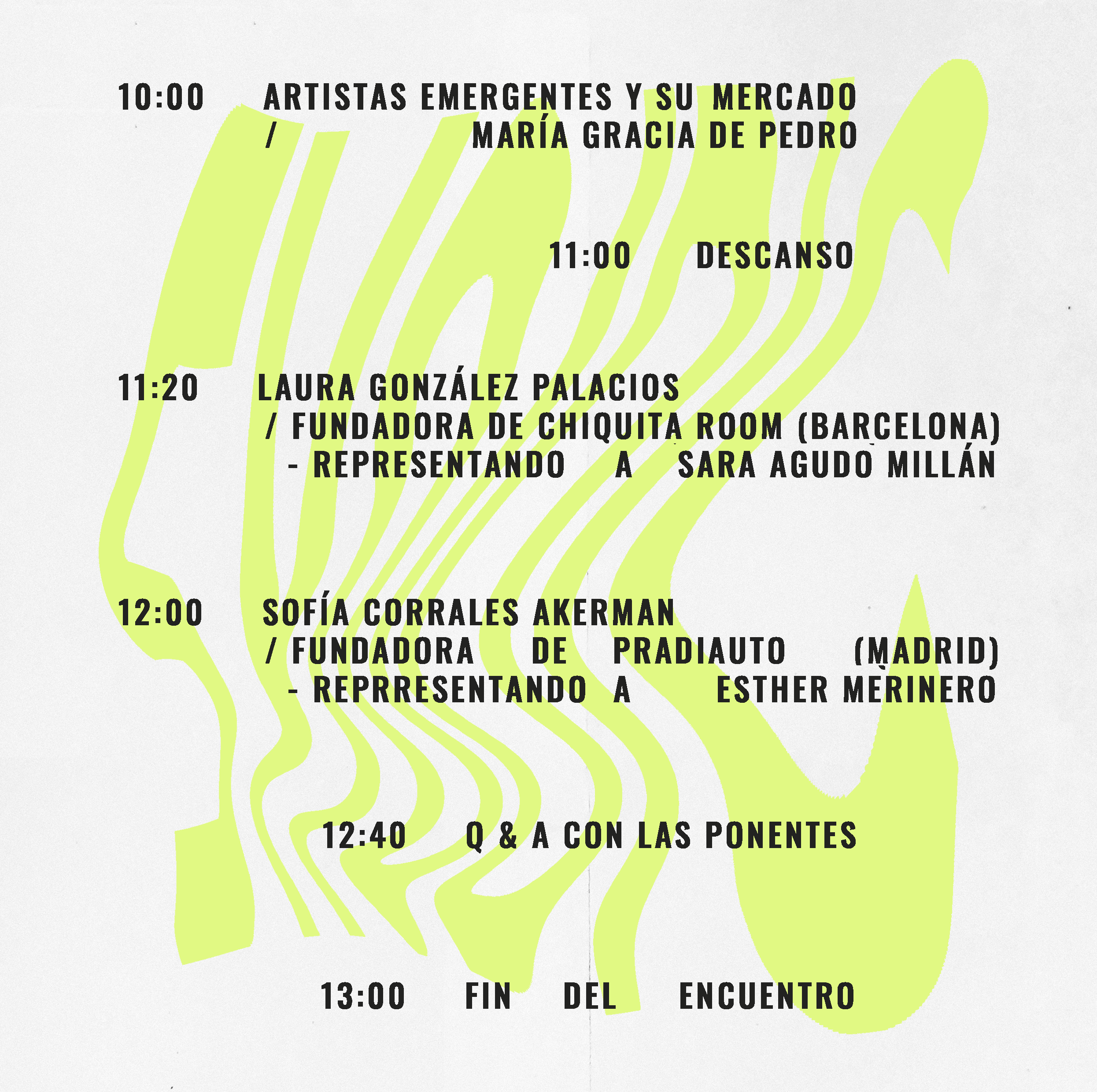 10.05h - ‘Artistas emergentes y su mercado,’ por Maria Gracia de Pedro. Presentación de su doctorado “Los artistas emergentes y su mercado. Estrategias para su desarrollo del ámbito académico al profesional”. Además compartirá su experiencia como comisaria y directora de varias galerías, entre ellas JosédelaFuente y actualmente Badr El Jundi (Marbella). María es co-fundadora de hiato Projects, profesora de Mercado del Arte Contemporáneo en el máster de Gestión del Mercado del Arte en la Universidad Rey Juan Carlos (Madrid) y ha escrito para diferentes publicaciones internacionales como Exit, A*Desk, Daily Lazy, entre otros.