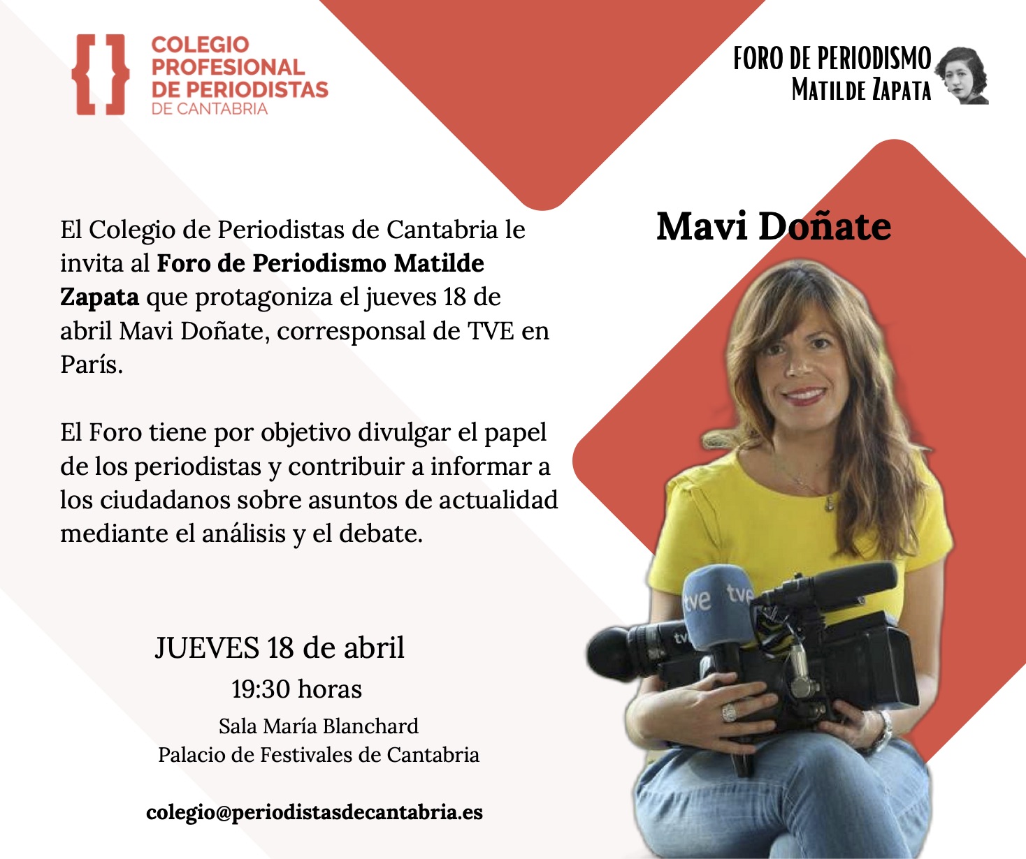 El Colegio de Periodistas de Cantabria organiza el Foro de Periodismo Matilde Zapata que el jueves 18 de abril contará con la presencia de Mavi Doñate, corresponsal de TVE en París.