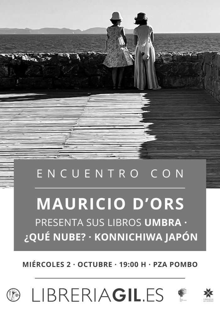 El miércoles 2 de octubre, a las 19:00 h. tendrá lugar en la Librería Gil de la Plaza de Pombo un encuentro con Mauricio D'Ors, que presentará sus libros “Umbra”, “¿Qué nube?” y Konnichiwa Japón".