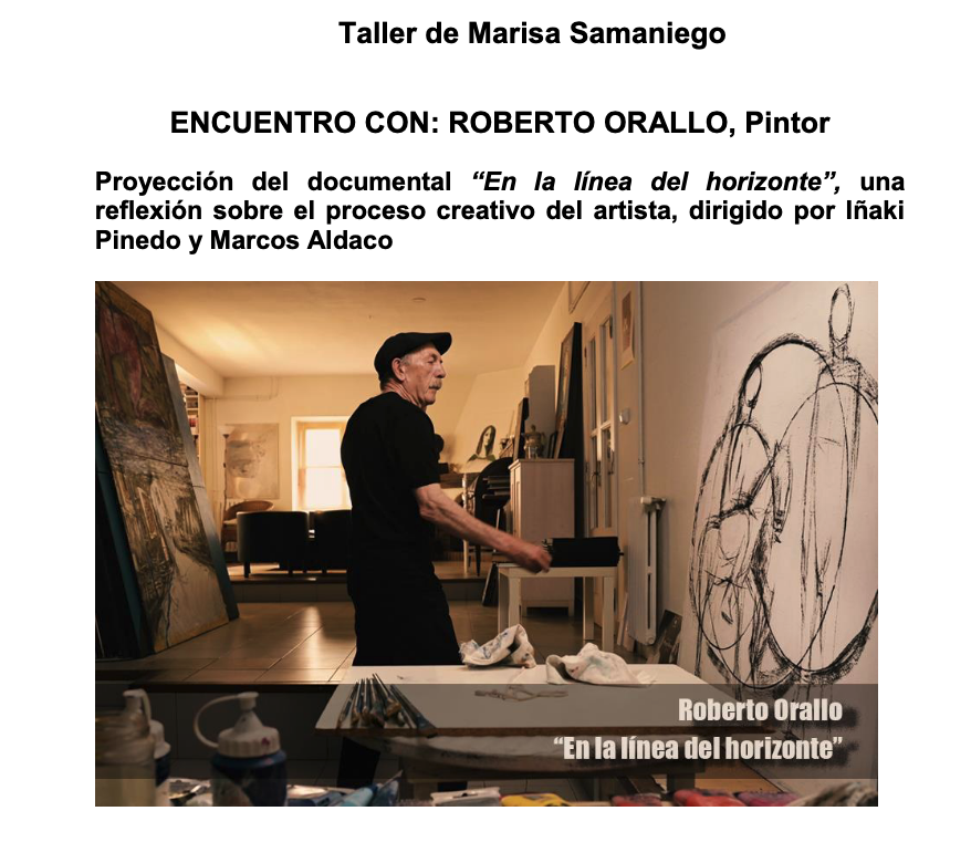 El miércoles 16 de octubre de 2024, a las 18:00 horas, en el taller que Marisa Samaniego dirige en el Centro Cultural Matilde de la Torre, tendrá lugar un encuentro con el pintor Roberto Orallo. Además se proyectará el documental “En la línea del horizonte” una reflexión sobre el proceso creativo del artista y la influencia que tiene sobre él mismo el ambiente, el entorno, dirigido por Iñaki Pinedo y Marcos Aldaco.