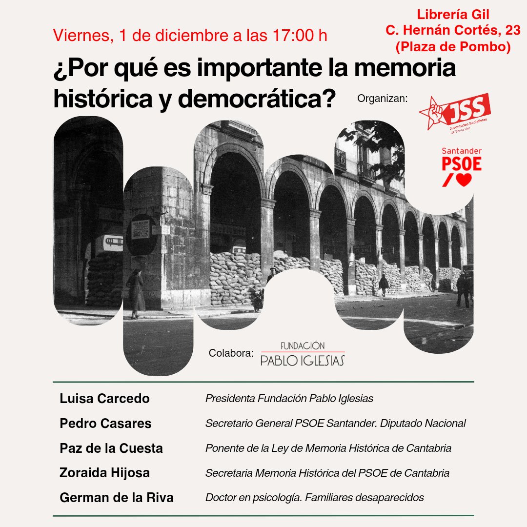 El viernes 1 de diciembre, a las 17:00 h. la Librería Gil acoge el encuentro y charla "¿Por qué es importante la memoria histórica y democrática?", organizado por el Partido Socialista de Santander y Juventudes Socialistas de Santander, con la colaboración de la Fundación Pablo Iglesias.
