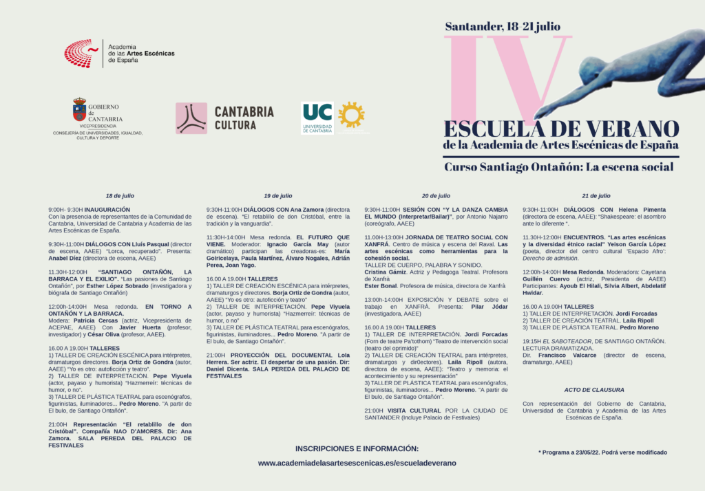 Un año más, la Academia de las Artes Escénicas de España plantea una actividad en su Escuela de Verano. Por cuarta vez, se produce la colaboración entre varias instituciones públicas para ofrecer un programa que une rigor, excelencia y entretenimiento, para que jóvenes de diversas comunidades participen en un proyecto de formación. Este año, Cantabria es la referencia ideal para, a partir de una personalidad tan destacada del mundo de la escena como Santiago Ontañón, considerar, junto a su condición de artista plástico de primer nivel, la actualidad de la escena social en sus formas más destacadas.