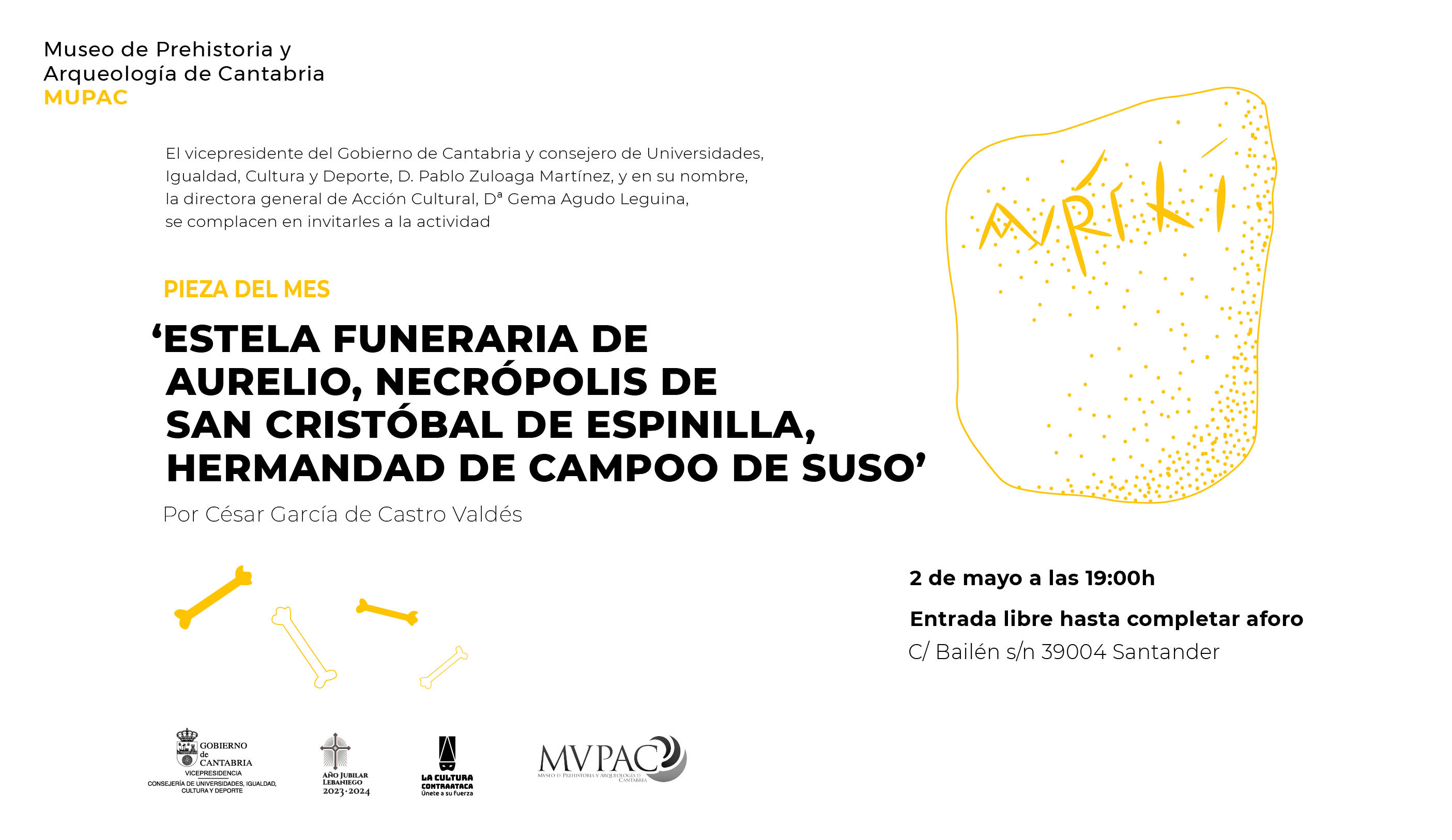 Dentro del ciclo La pieza del Mes, el Museo de Prehistoria y Arqueología de Cantabria (MUPAC) acoge la conferencia sobre la “Estela funeraria de Aurelio, necrópolis de San Cristóbal de Espinilla, hermandad de Campoo de Suso”, que será impartida por César García de Castro Valdés.