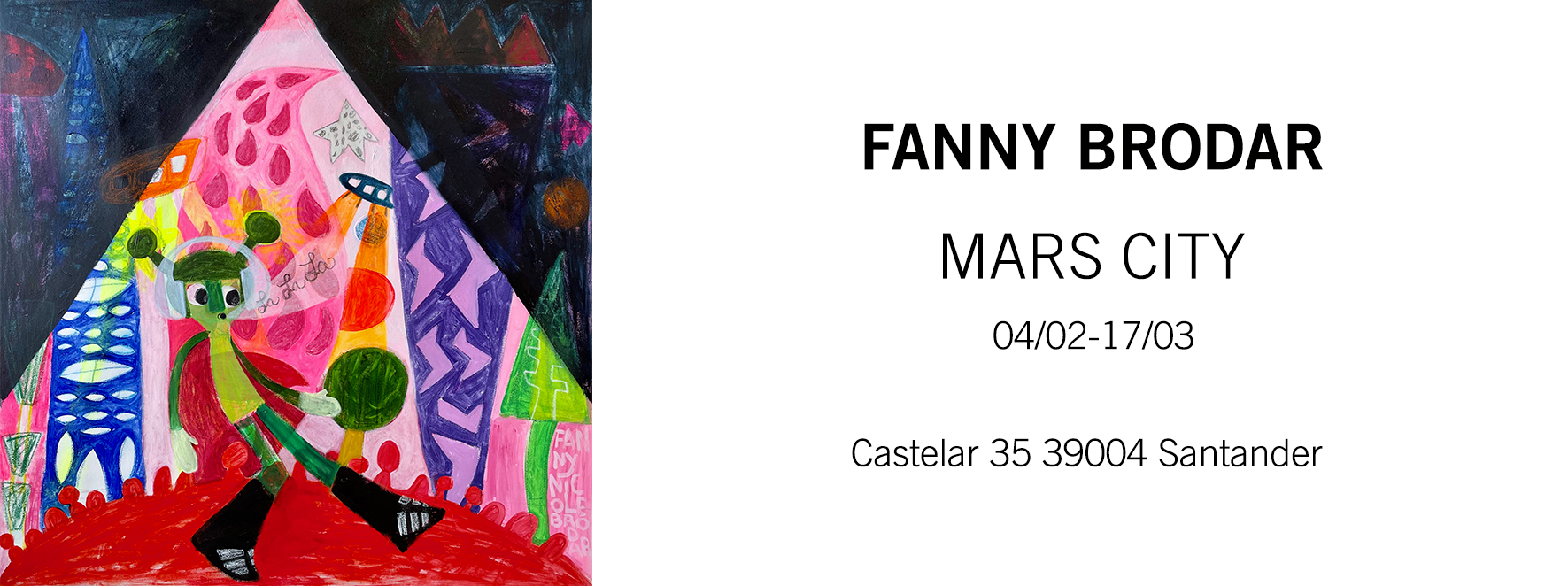 Para Fanny Brodar, pintar es como entrar en este lugar ; es un tapiz eufórico tejido por los recuerdos de la infancia, los preciosos momentos en la actualidad y el enigma de lugares como Marte. Los colores brillantes, las marcas infantiles y las palabras garabateadas invitan al espectador a profundizar en su propia imaginación y cuestionar qué es real y qué es fantasía.
