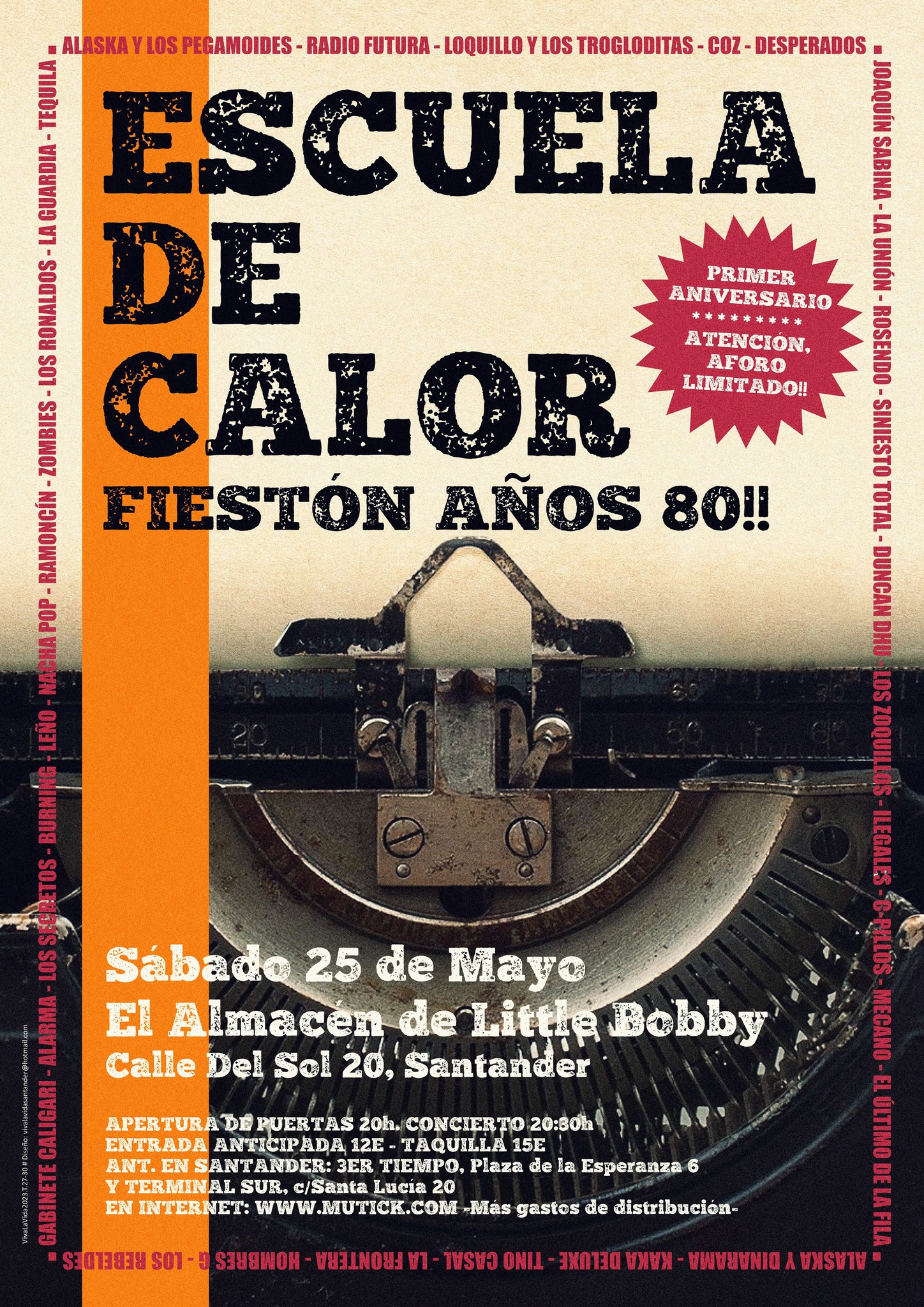 El sábado 25 de mayo celebran el primer aniversario de Escuela de Calor por todo lo alto en Little Bobby Santander. Lo mejor de los 80 nacionales comandados por David DeLlera (voz, guitarra acústica, eléctrica y hammond) junto al increíble Diego Irizabal (bajo y voz) y la palpitante batería de Eder Carrascal.