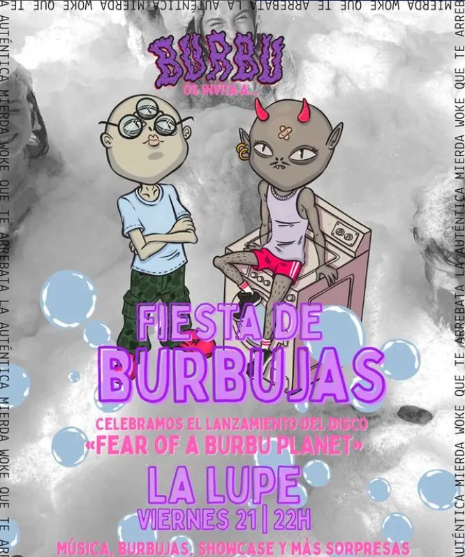 “Fear of a BURBU Planet” es el nuevo trabajo del dúo BURBU, formado por dos míticos, DJ UVE y Ludovico. El disco mantiene la esencia del proyecto: lo que ellos denominan hip hop burbujeante, una mezcla de compromiso social, provocación y beats preparados para la pista de baile. DJ UVE ofrece una producción más potente que nunca, mientras que Ludovico destila sus letras en píldoras afiladas, divertidas pero cargadas de significado.