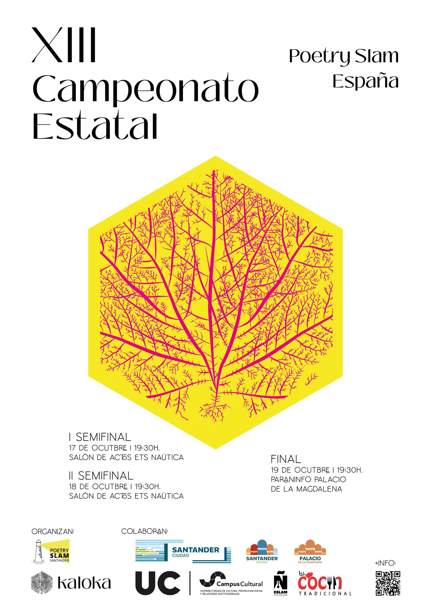 El XIII Campeonato Estatal de Poetry Slam celebra sus semifinales los días 17 y 18 de octubre en el salón de actos de la ETS de Naútica de la Universidad de Cantabria y su final el sábado 19 de octubre en el Paraninfo del Palacio de la Magdalena.