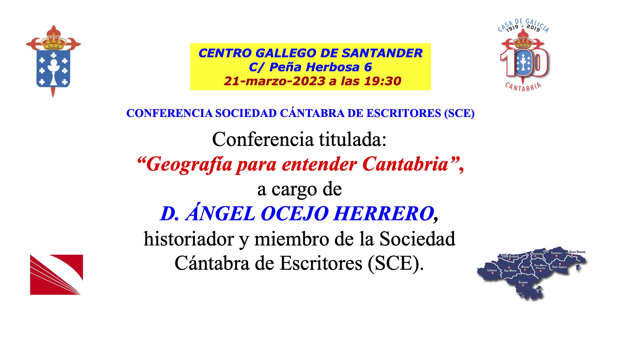 El martes 21 de marzo a las 19:30 h. el Centro Gallego de Santander acoge la conferencia titulada “Geografía para entender Cantabria”, a cargo de Ángel Ocejo Herrero, historiador y miembro de la Sociedad Cántabra de Escritores (SCE).